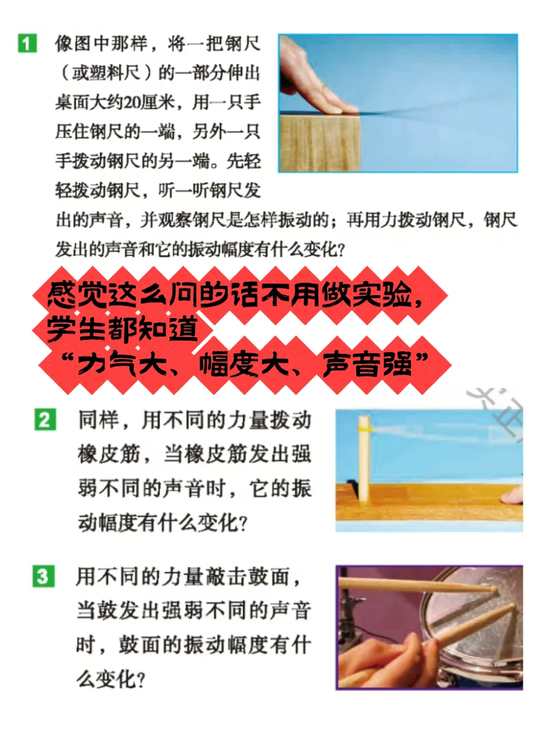 感觉是因为【看似简单的结论】,导致学生没有深度思考,也就没真正理解【力度】、【幅度】、【声音强度】的关联