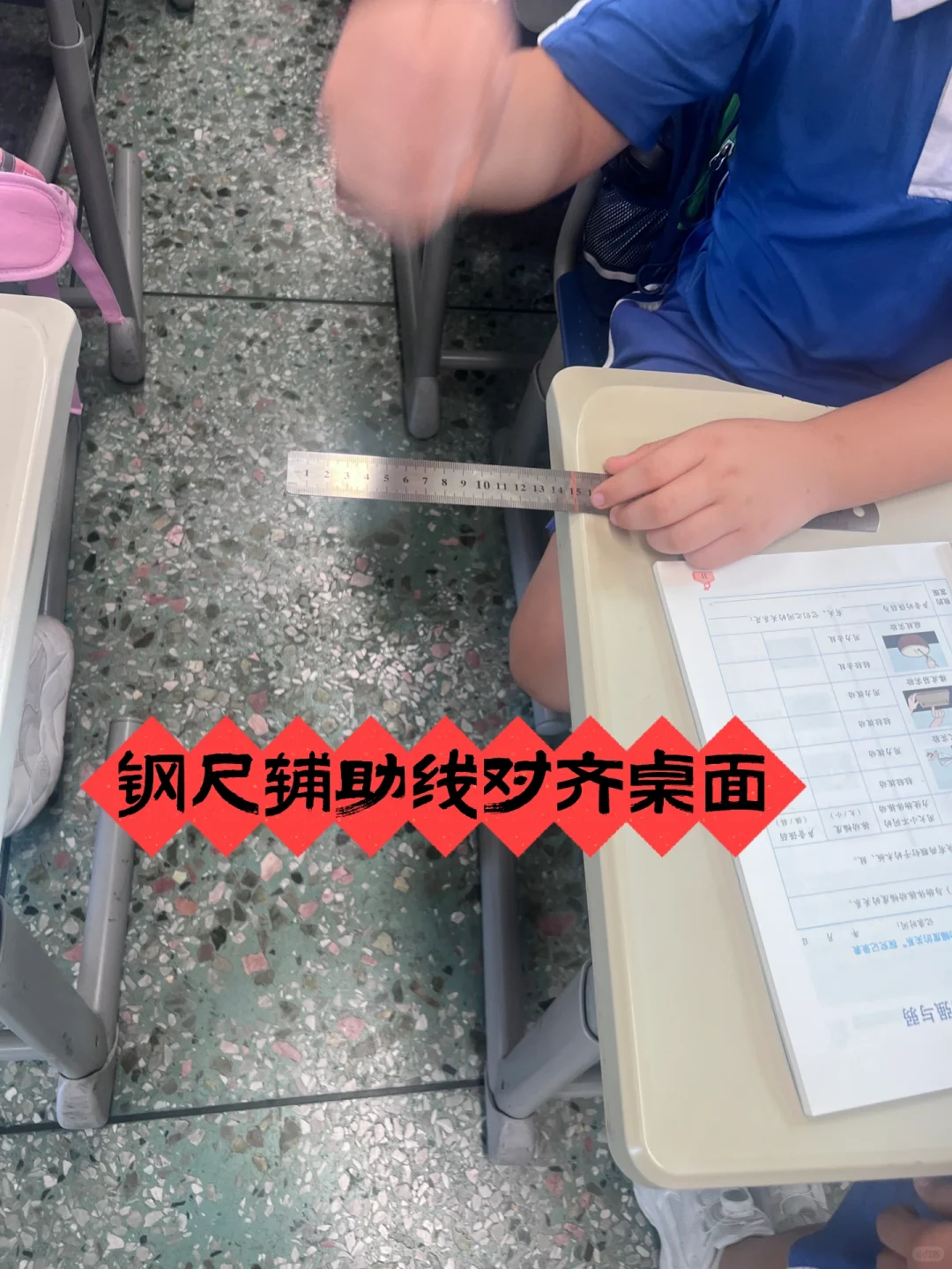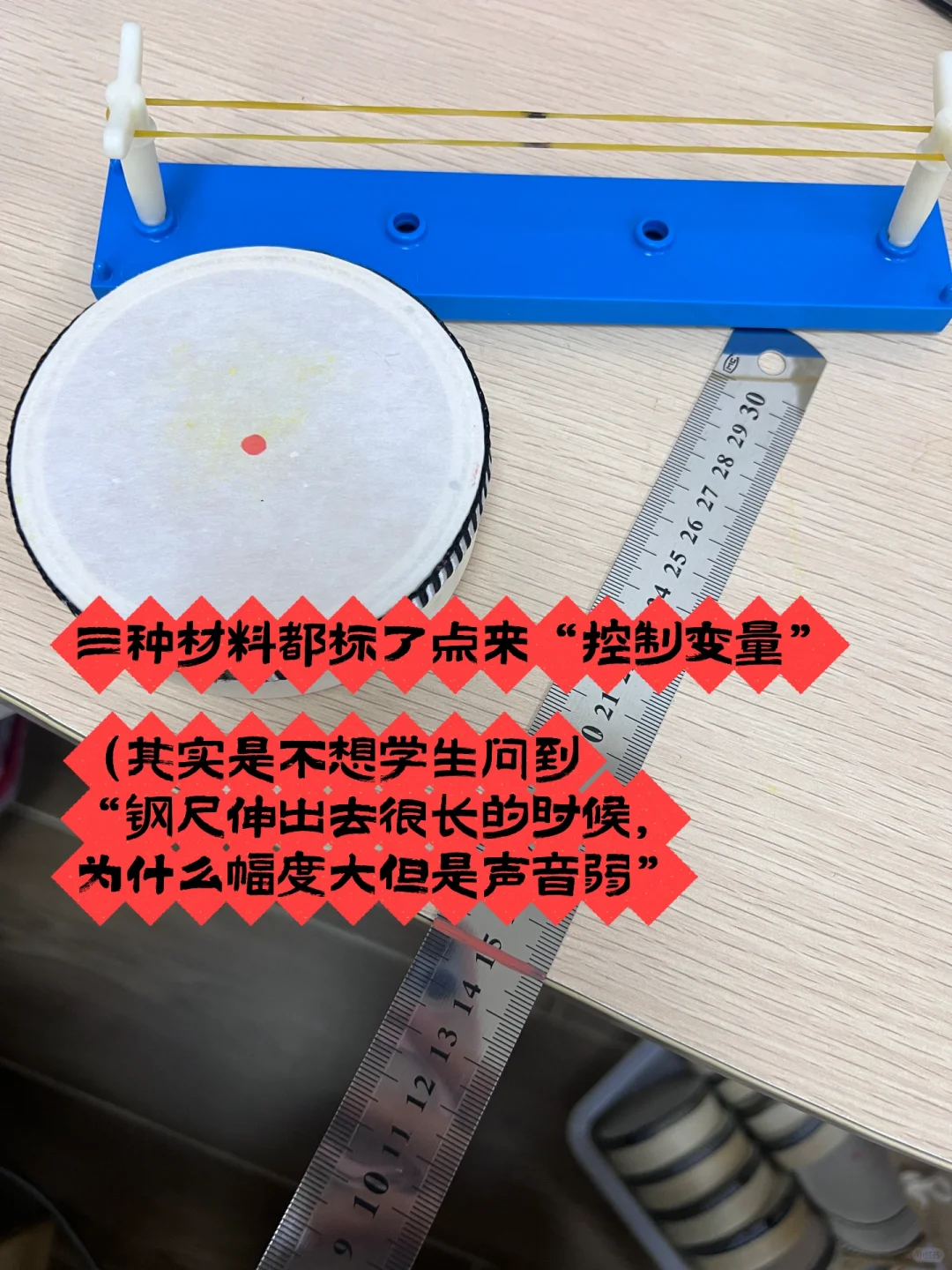 (好像因为空气阻碍了振动传递,比较难解释,所以就在钢尺上标了线,让学生可以对齐桌面