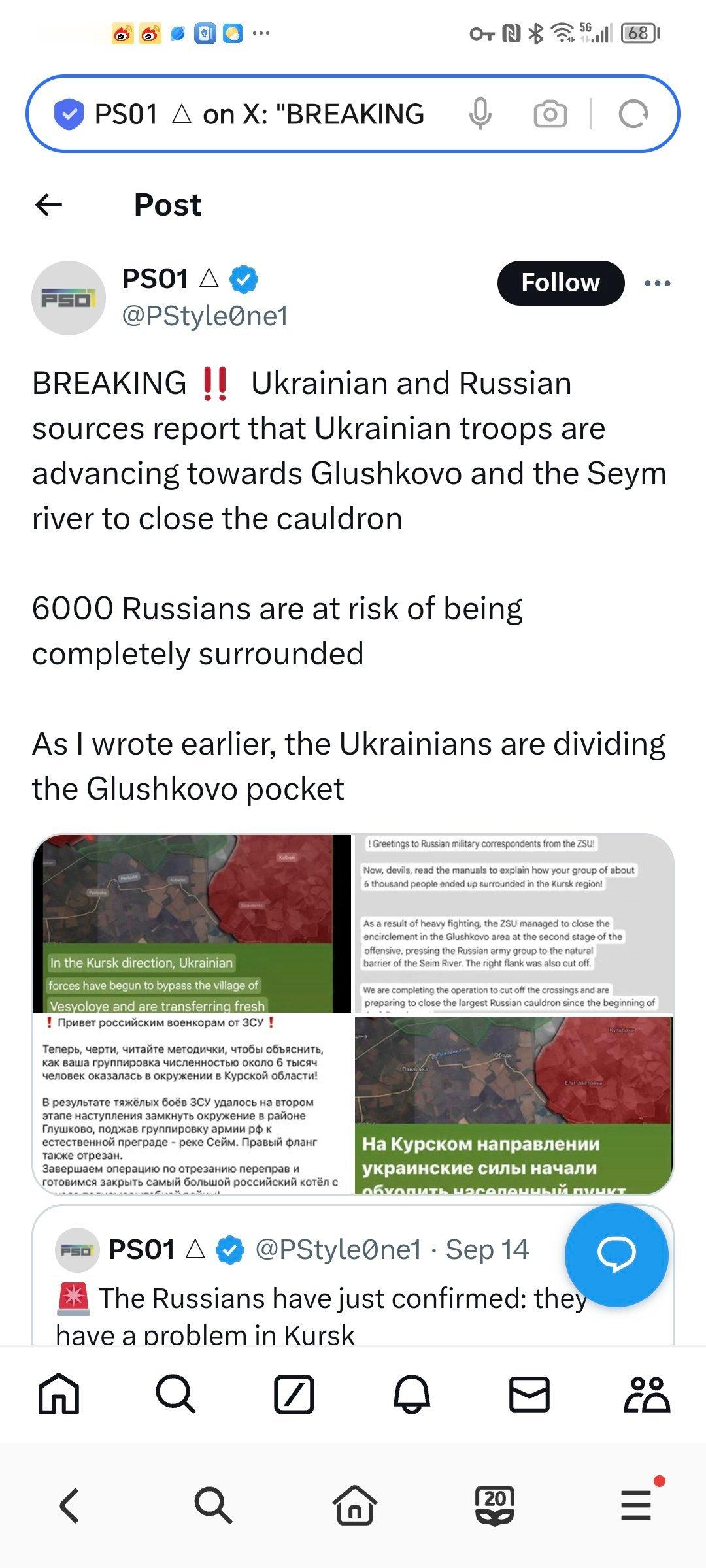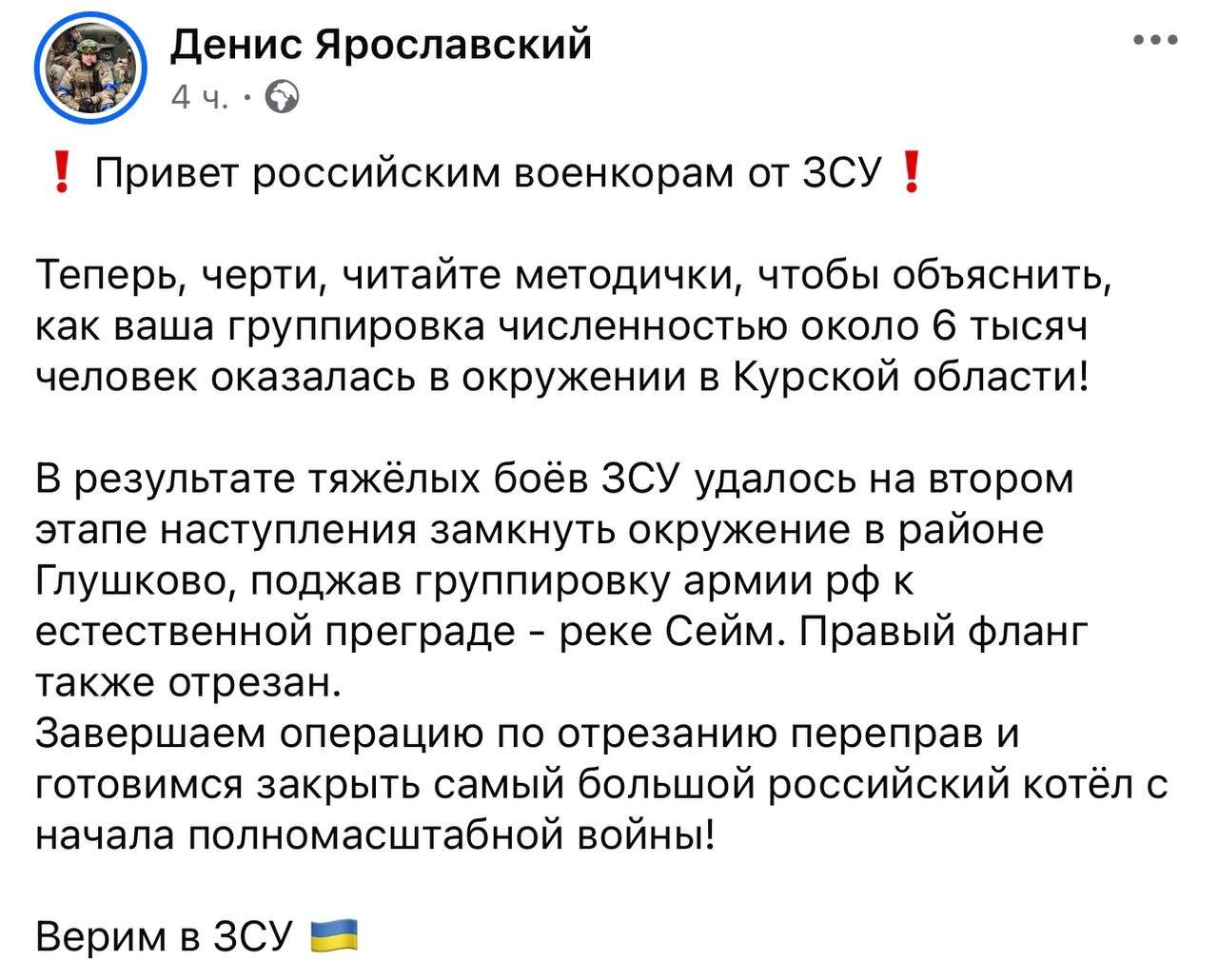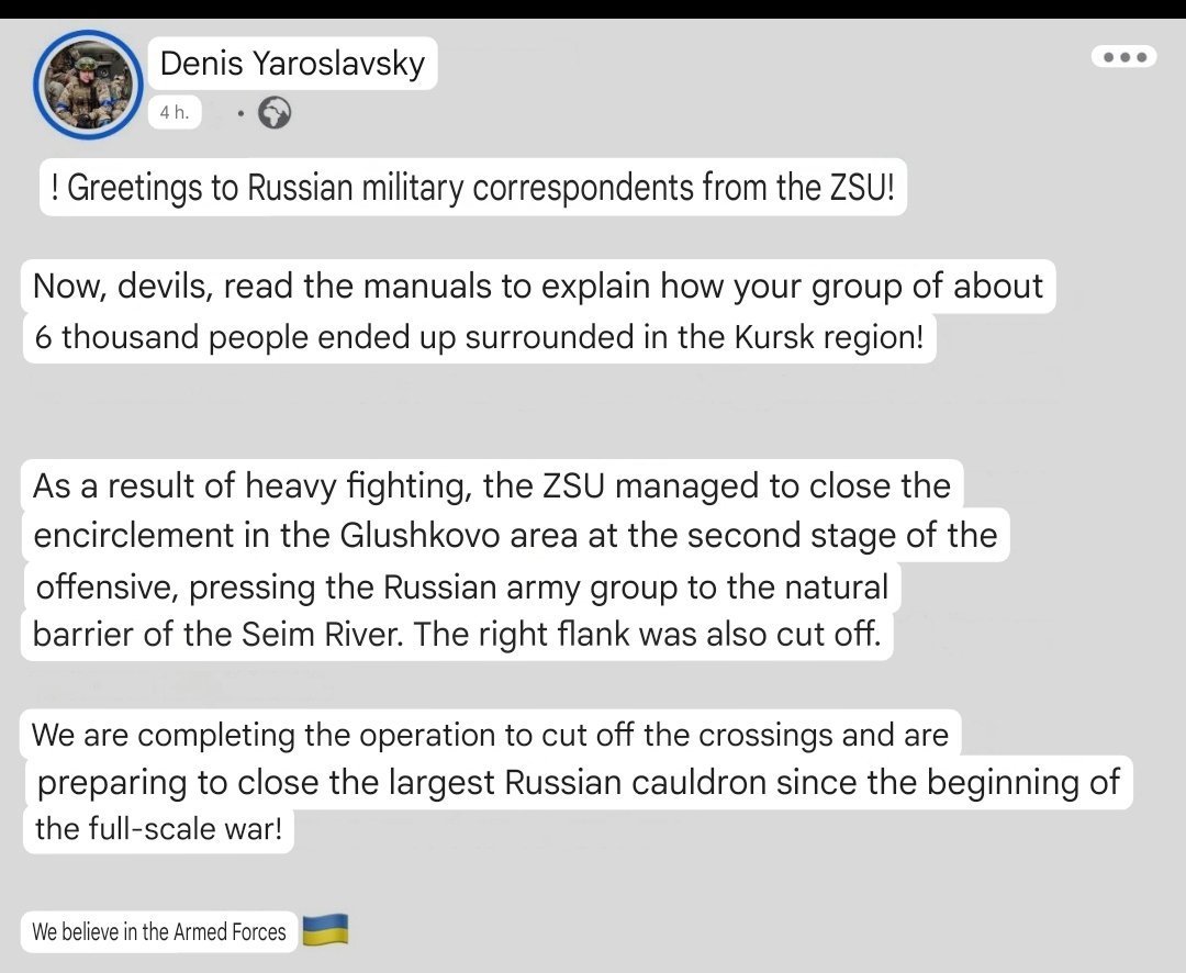 乌克兰和俄罗斯消息来源称,乌克兰军队正向格卢什科沃和塞姆河推进,以关闭该“包围圈” 。