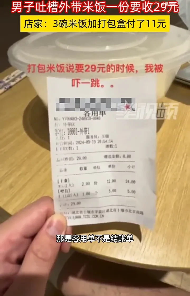 9月19日,湖北十堰一名男子发视频称,自己在餐厅打包了一份米饭,被收了29元,感觉快吃不起饭了。对此餐厅工作人员回应,这是客用单,不是结账单,最终打包了3小碗加一个大打包盒,实际支付11元。