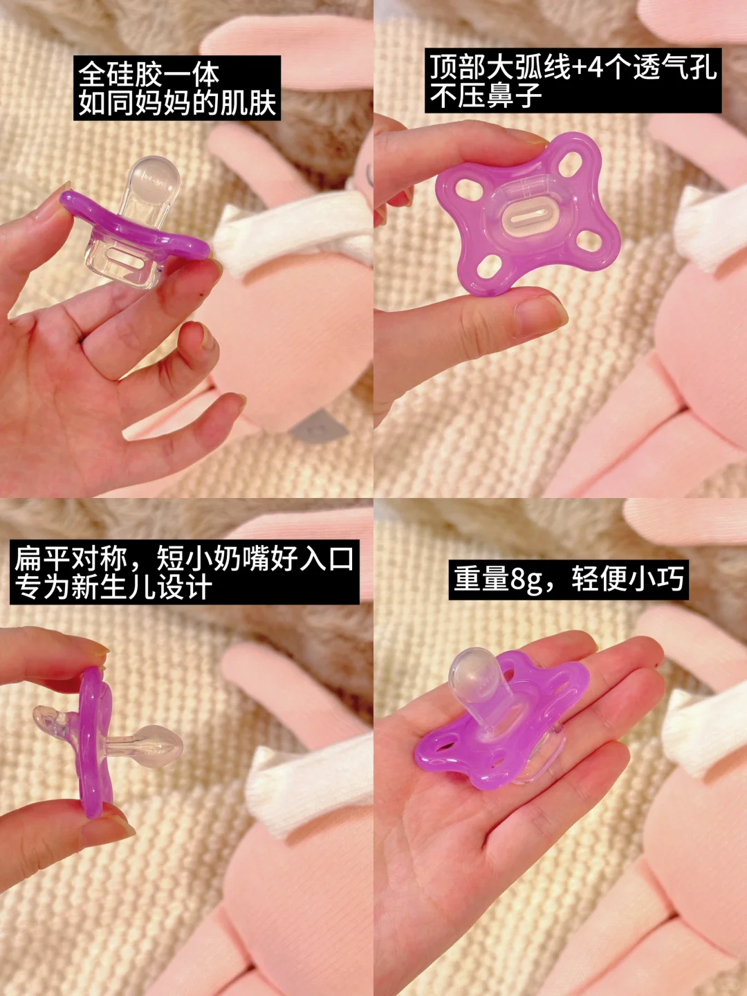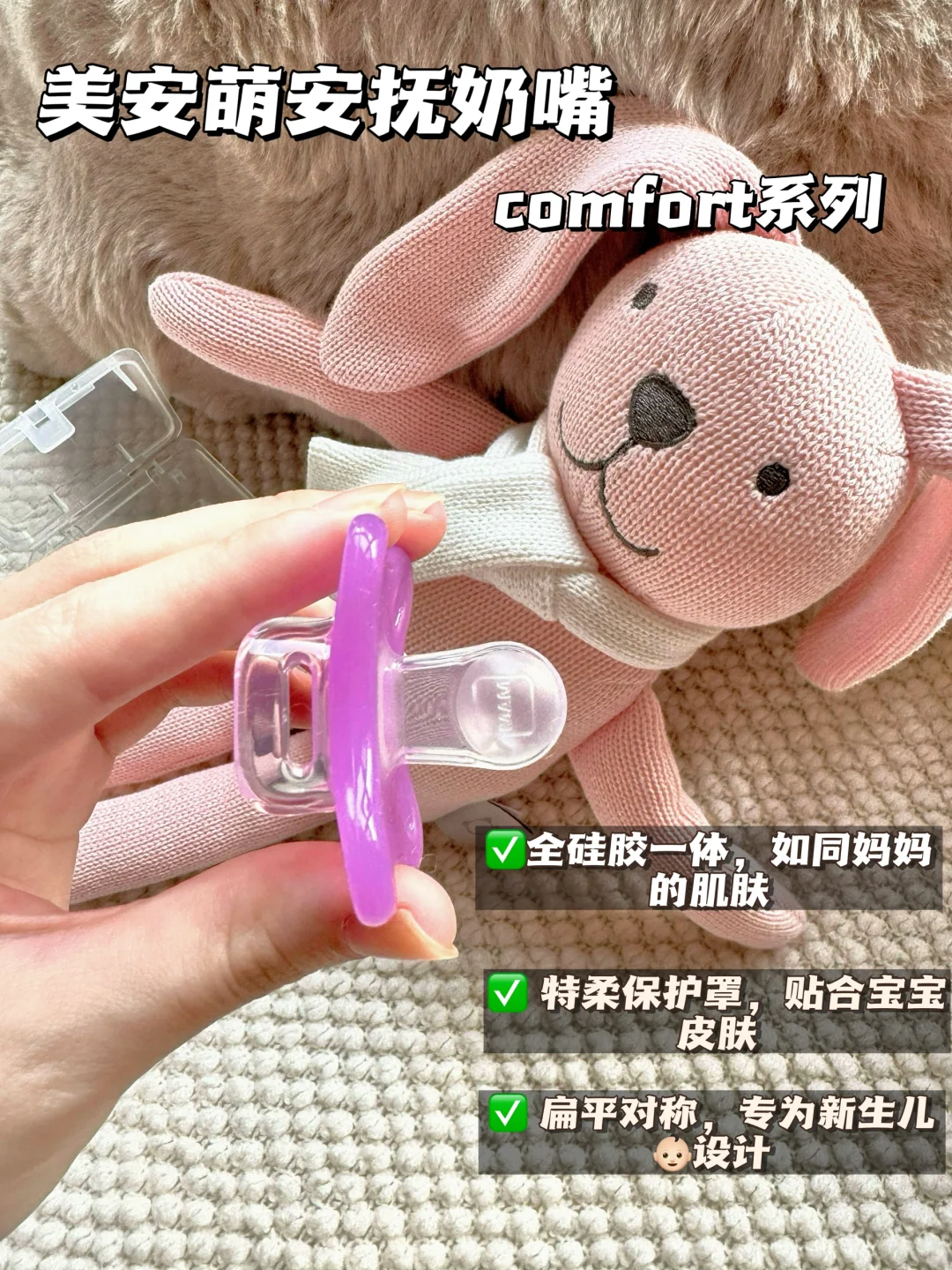 1⃣comfort系列奶嘴,全硅胶一体的材质,扁扁头的设计很贴心,而且很小很轻只有8g,很适合新生儿宝宝~