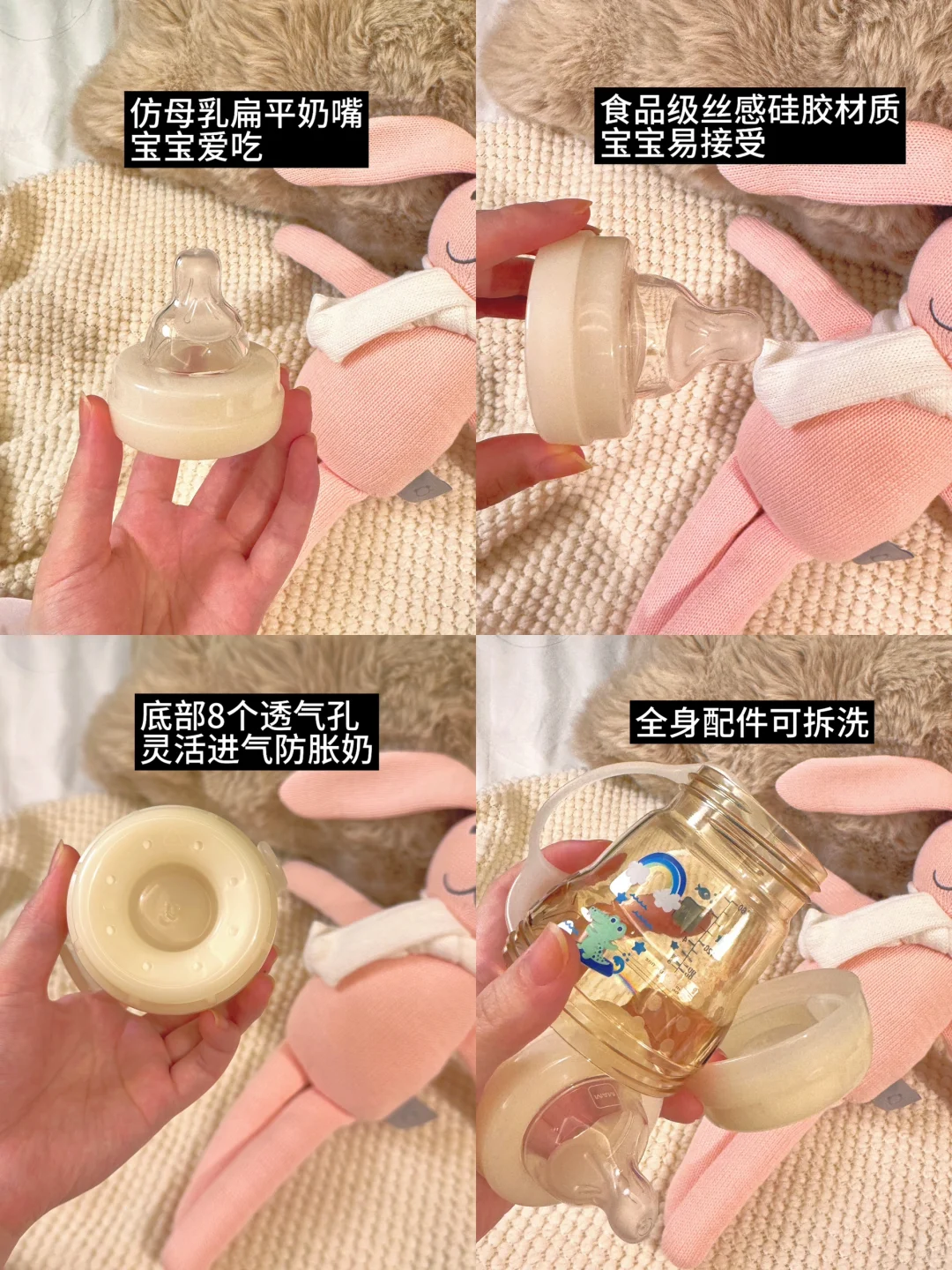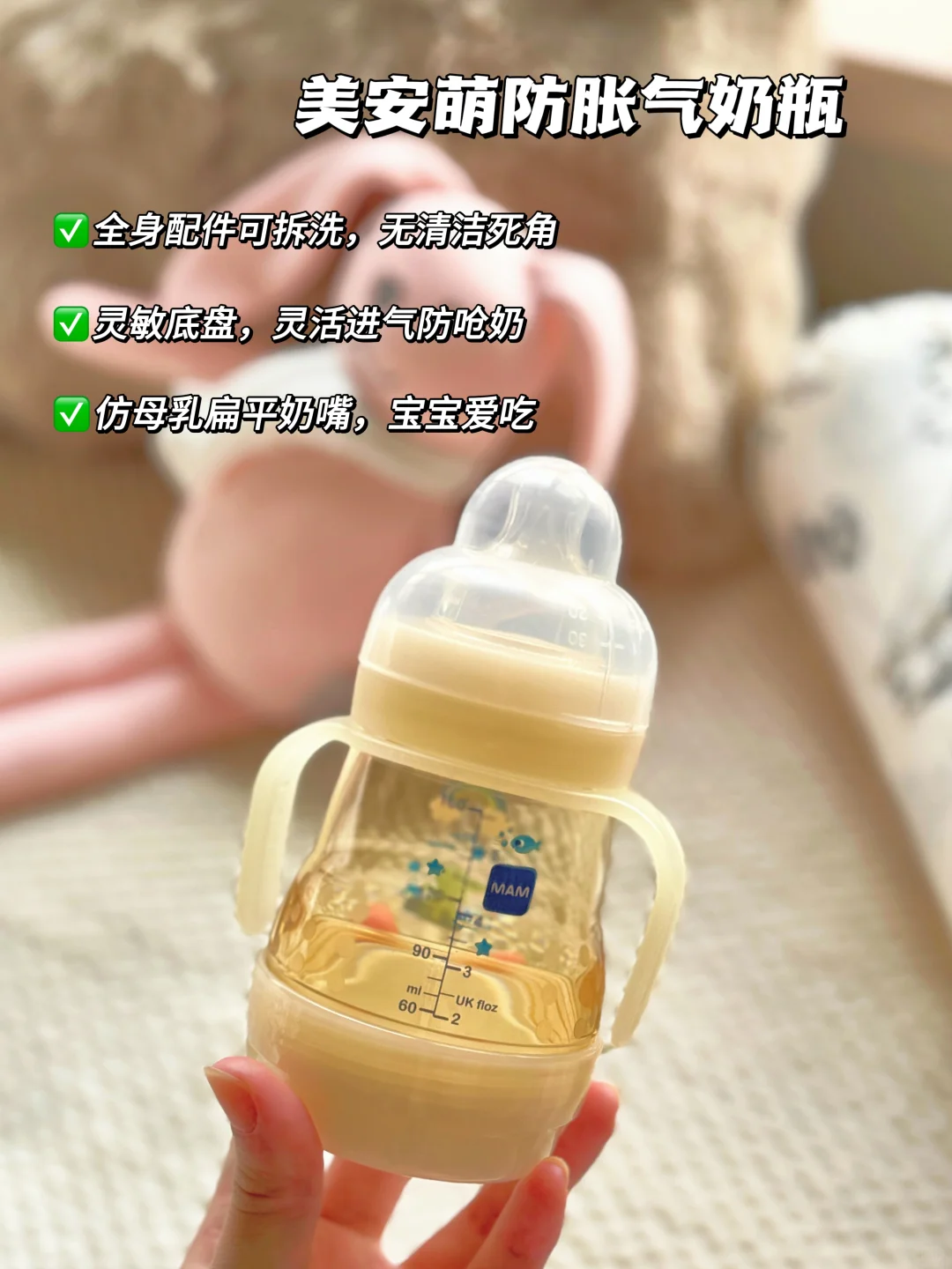 奶瓶也是玻璃奶瓶和防胀气奶瓶各准备了一个,我朋友特别推荐美安萌防胀气奶瓶🍼我也仔细看了它的设计:底部做了专门回气的设计,空气是不经过奶液的,就不用担心宝宝喝奶的时候有气体导致肚子不舒服之类的!整个奶瓶也是做了全拆卸,宽口径,洗奶瓶也能更好的清洗,不费妈哈哈哈哈