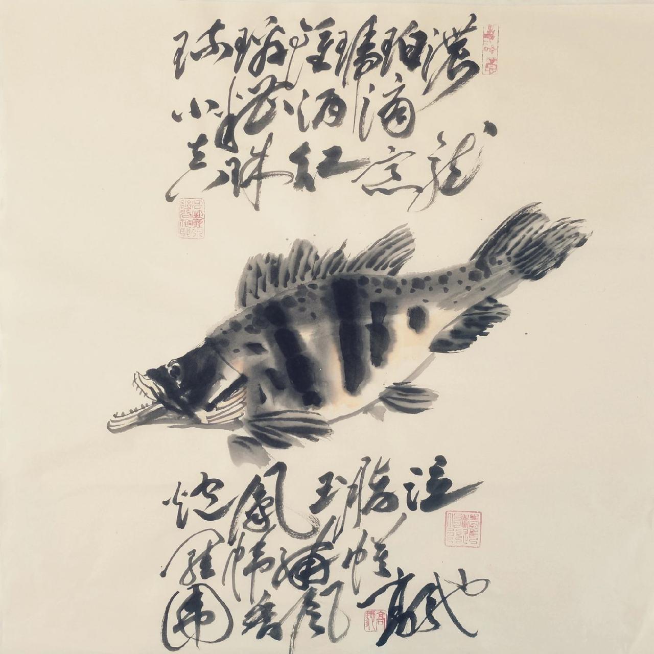 鳜鱼别称鳌花鱼桂鱼(贵余) 不喜群居以活鱼虾为食 富鳜有鱼名鳜珍肴 任致《高驰书画鳌花鱼图赞》 高驰神笔绘奇珍,鳌花腾跃墨痕新。 清影独映清江畔,孤姿静展画卷中。 诗行错落增幽趣,鱼态悠然映碧粼。 岁月无声情满溢,名鱼入画醉心尘。
