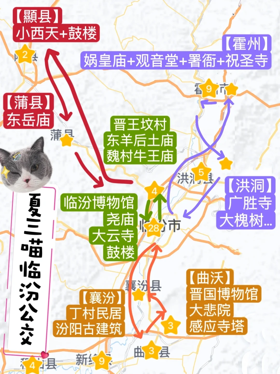 7️⃣临汾博物馆、尧庙、大云寺、鼓楼共享电单车/公交,打车10元左右。