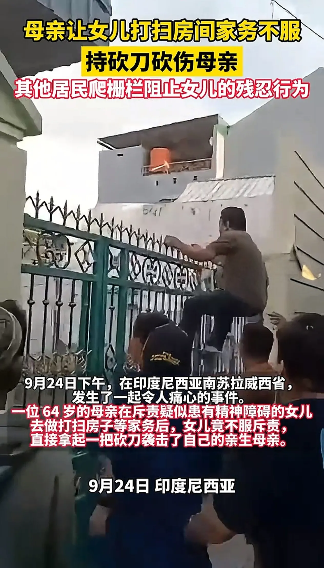 事情发生于9月24日下午,一位64岁的老母亲,训斥患有精神障碍的女儿在家里啥也不干,要求去把家里卫生打扫一遍,女儿不服母亲的训斥,瞬间怒火中烧拿起家里的一把砍刀,就疯狂袭击自己的亲生母亲,这件令人痛心的事,发生于印度尼西亚南苏拉威西省望加锡市。