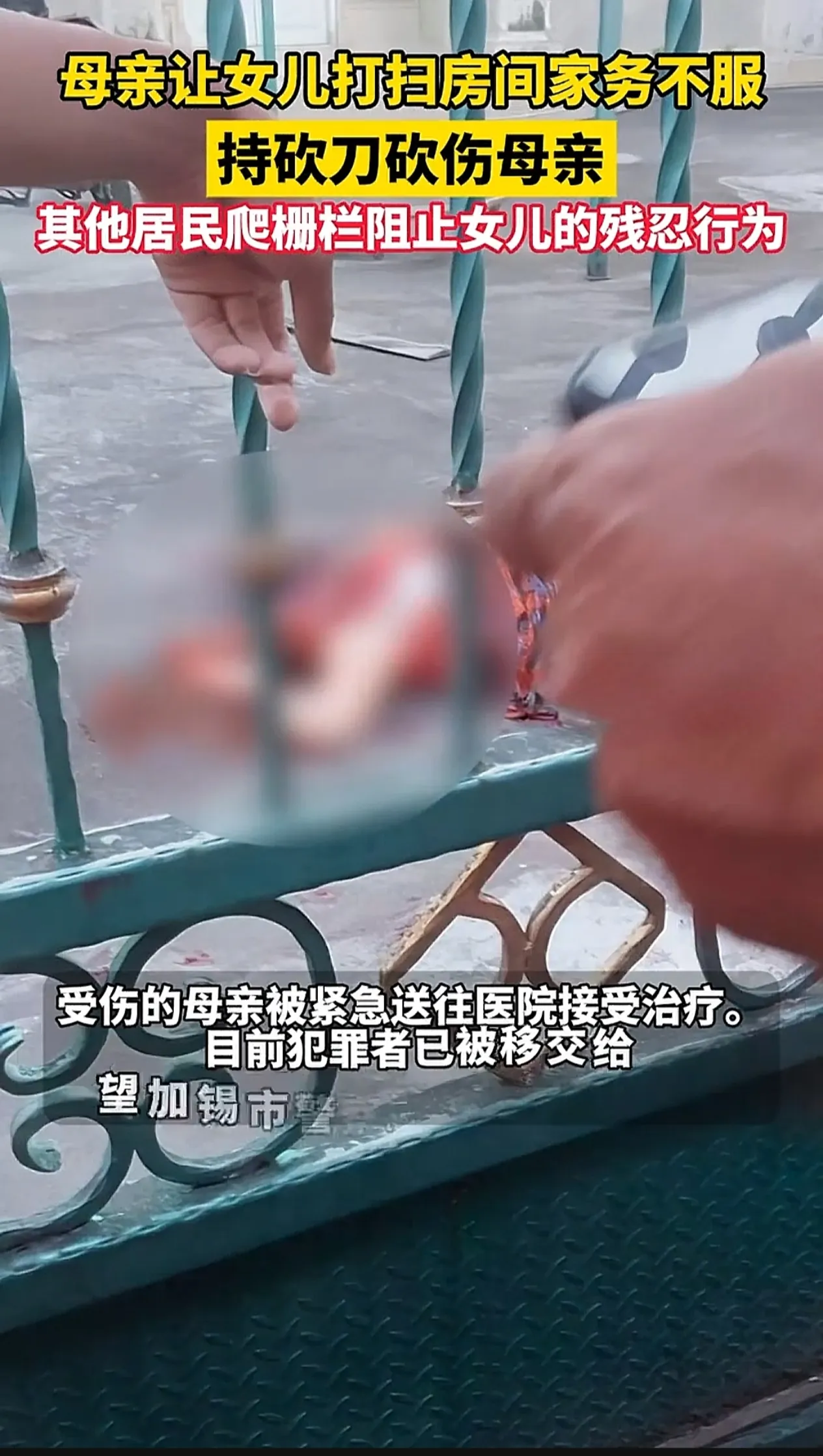 老母亲看到女儿拿着刀要砍自己,吓得从屋内连滚带爬,跑到院子里准备逃生,谁知大门关闭,还没等打开门,有精神障碍的女儿就已经追到大门口,在自家的入户大铁门前,持刀将老母亲砍倒在地,有路过的群众发现后及时呵斥,往大门里面扔木板之类的物品,才阻止了其继续持刀行凶的行为,精神障碍的女子看到很多的群众后,吓得跑回屋内,大量的群众集体把铁门打开后,把受伤的母亲送往了医院接受治疗。