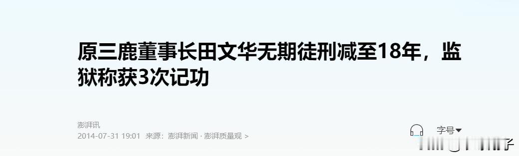 “还有没有王法了?”曾经毒害了近30万婴儿的罪人,竟然有望在2027年出狱了,她在狱中表现良好,五年的时间就获减刑三次,还扭转了自己的后半辈子,将无期徒刑变为有期。 每年的315晚会都会进行食品安全的检测,也为我们现在的食品安全做出了更好的保障,但在2008年,出现了一个震惊全国的恶性事件。 三鹿奶粉想必大家都听说过,但却不是因为这个奶粉多么多么的好而出名,完全是因为它对近30万婴儿造成的无法扭转的伤害。 三鹿奶粉刚开始出现在市场上的时候,大家都认为它的奶粉非常的有营养,而且价格也要比其他奶粉便宜一点。 有了更好的选择后,三鹿奶粉便成为了老百姓中最爱给孩子买的奶粉了。 没过多久,三鹿奶粉便成为了我国乳制品是一匹“黑马”,因为它一直宣传的都是别的奶粉没有的东西,他们有自己的配方,对孩子的成长更有帮助。 但也有不少人反映,三鹿奶粉并不健康,有不少孩子喝了三鹿奶粉之后,自己的孩子开始变得频繁的生病,甚至还有六名婴儿因为三鹿奶粉而去世。 慢慢的有记者注意到这件事情了,他们偷偷进入到了工厂,才发现三鹿的奶粉中添加了非常有害身体的原料。 这种原料据专家表示本质上,是只给动物吃的,但没想到将这种原料加入到了,婴儿的奶粉当中,气愤的记者将这件事情登上了报纸。 三鹿奶粉的有害原料给不少家庭都带来了冲击,当他们意识到的时候,孩子却已经长大了,而且都有着同一个特征,那就是脑袋非常的大。 当时的三鹿奶粉为了能够提升市场的知名度,在奶粉里添加里了三聚氰胺,便将奶粉售卖了出去,但是因为质量不过关,遭到了不少投诉。 三鹿奶粉并没有将这些事情放在心上,而是用钱解决了事情,之后这件事情暴露出来之后,三鹿集团彻底没有了退路。 三鹿奶粉被告上了法庭,相关的工作人员也被法院宣判了死刑,但董事长田文华却被宣判了无期徒刑。 不少人认为对三鹿奶粉的董事长的判决不解人恨,她应该也被判决为死刑,但这是法院的判决,不是通过言论就可以改变的。 田文华进入到了监狱之后,在监狱里面表现良好,还在期间立了三次功,甚至将自己当地无期徒刑变为了有期徒刑,到现在已经被宣称可能会在2027年出狱。 面对这样的新闻也有很多人表示非常难以接受,田文华即将出狱,但自己的孩子却永远都无法恢复健康。 也有不少家庭因为三鹿奶粉,永远失去了自己的孩子,而这些都没有人能够为他们进行补偿,他们的伤疤永远都无法愈合。 而吃着三鹿奶粉长大的孩子,现在大部分的孩子身体非常的不好,更有甚者需要每天吃着药、在医院躺着度过自己的一生,这些伤痛也是无法弥补的。 现如今,每年的315晚会都是大家最关注的,我们也能通过这种国家的渠道,来捍卫自己的权益,也捍卫自己的健康。 对此你有何看法呢?欢迎评论区留言讨论。 主页有更多相关内容,点个【关注】不迷路,感谢您的支持,我们下期见! (来源:澎湃新闻 2014-07-31 《原三鹿董事长田文华无期徒刑减至18年,监狱称获3次记功》)