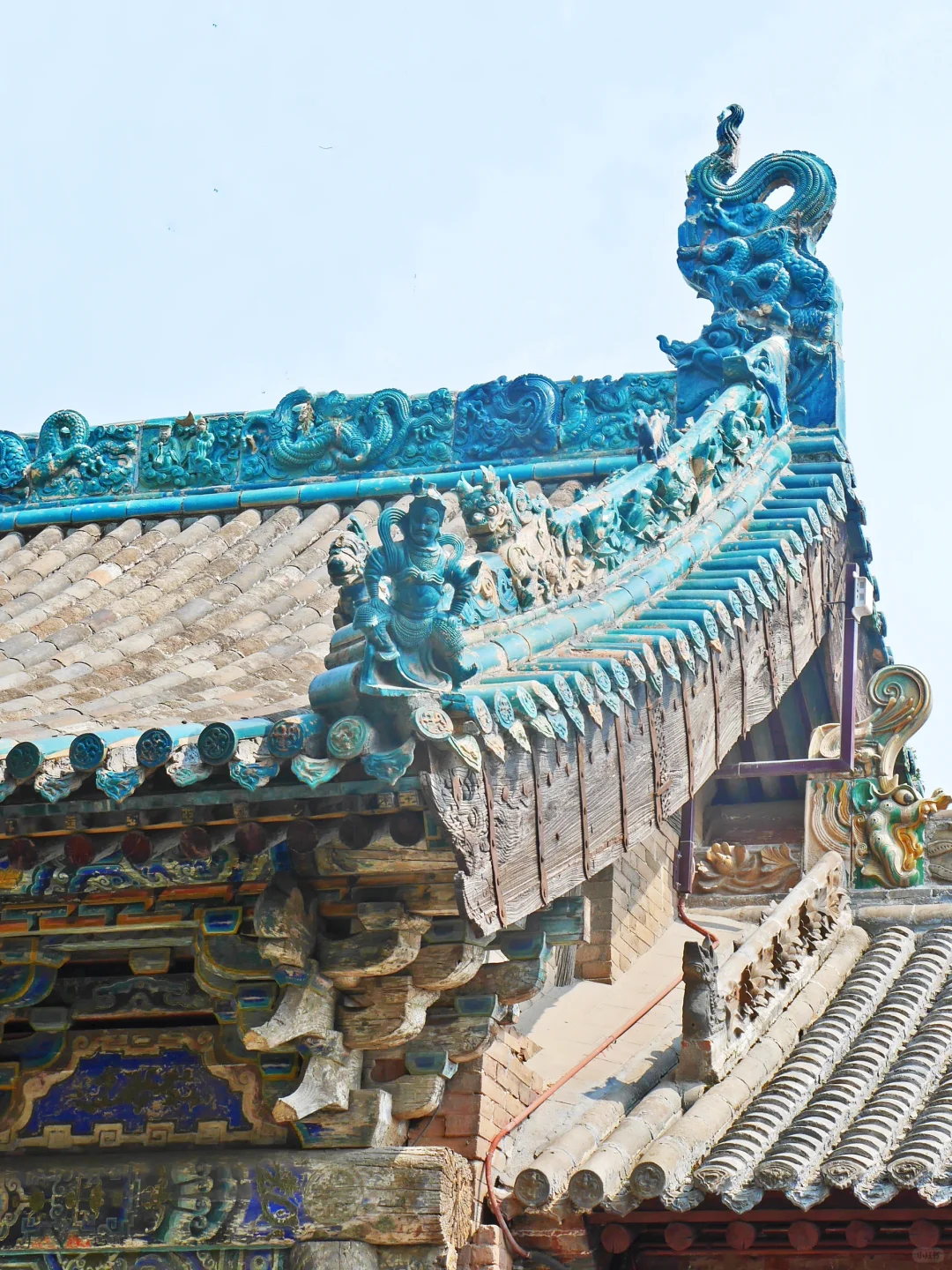 顶部琉璃是少见的孔雀蓝,非常明艳