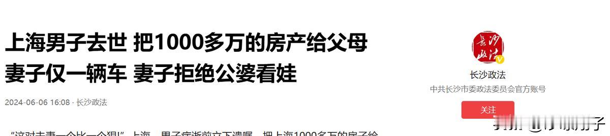 “这对夫妻算是走到头了!”上海,一男子在离世前,留下了遗嘱,他将自己上千万的房子留给了父母,又将老家价值百万的房子留给了姐姐,却只留给自己亲生儿子40万,留给妻子一辆二手车,面对这样的遗嘱,妻子非常生气并搬离家庭,并不允许他们看孩子,两个老人为了看到孙子,将自己的儿媳告上了法庭,法庭的判决亮了。 陆洋(化名)出生在上海,家里的条件并不太好,他的姐姐为了能够让他有大学上,初中刚毕业就出门在外打工了。 陆洋也非常的争气,考上了一所很不错的大学,还凭借着自己的努力在毕业的时候,获得了优秀毕业生的称号。 之后他顺利的进入了自己梦寐以求的公司,在工作期间他尽职尽责,很快就当上了一个小领导。 在工作的时候他还遇上了自己的妻子,和她是一个公司的,两个人慢慢的日久生情,在相爱两年后确定了彼此的心意。 之后两个人也顺利的走向了婚姻的殿堂,还生了一个可爱的孩子,他们的生活正朝着幸福的方向前进。 之后陆洋也在不断的升职,他此时正处在人生的巅峰期,但是正在他洋洋得意的时候,却被告知自己已经是肺癌晚期了。 这对于他来说无疑是巨大的打击,但他也知道自己的时日不多了,便开始找律师立遗嘱了。 在他离世的前一个星期,律师当着他的面宣告了自己的遗嘱,他将上海的房子留给了父母,老家的房子留给了姐姐,留给自己的儿子40万,留给妻子一辆二手车。 当他的妻子听到这份遗嘱的时候,根本不敢相信这是每天和自己同眠共枕的丈夫,自己不敢说对他的照顾是方方面面,但是也算是细心从不出错。 况且在他病重的这段时间里,一直都是她在无微不至的照顾他,他非但没有感激之情,还将自己从这个家里面踢出去了。 当所有人都离开了之后,陆洋的妻子质问他为什么要这样做的时候,陆洋却告诉妻子他这么做都是有原因的。 他表示自己的父母年纪已经非常大了,在上海常居的话对他们的健康也十分的有帮助,能够及时医治,交通也十分的方便。 给姐姐的原因是她为自己付出了不少,并且她为了自己早早就出门打工,仍到至今还没有打工。 他在解释给妻子和儿子的财产时,表示是想让儿子靠着自己的努力挣大钱,也希望妻子能够在未来能够更加坚强。 他的这份解释并没有让妻子觉得他是一个好丈夫,但他的妻子表示会在他离世之前照顾好他,之后的时候他也管不到了。 在陆洋离世之后,妻子宋嘉(化名)就带着自己的孩子离开了,也不允许自己的公婆探望自己的孙子。 两位老人忍受不了不能见到自己外孙的日子,便将宋嘉告上了法庭,要求每个月有2次见面的机会。 在法庭上,双方都各执一词,两位老人认为她不能让自己不见自己的外孙,违反了法律,而宋嘉告表示在自己怀孕、坐月子的时候,他们从来都没有帮过忙,所以她认为他们并没有资格探视孩子。 法院也认为他们之间并没有亲情的基础,而宋嘉自己的孩子也不愿意和自己的爷爷奶奶近亲,便认为他们的探视可能会造成孩子身心出问题。 因此,陆洋的父母败诉了。 对此你有何看法呢?欢迎评论区留言讨论。 主页有更多相关内容,点个【关注】不迷路,感谢您的支持,我们下期见! (来源:长沙政法 2024-06-06 《上海男子去世 把1000多万的房产给父母 妻子仅一辆车 妻子拒绝公婆看娃》)