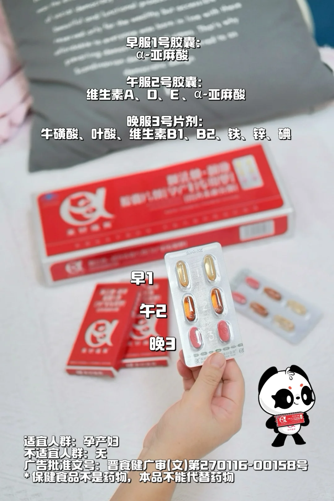 它是由官方认证的“孕产妇专用型营养补充剂”,每天补充1000mg α-亚麻酸(进阶版DHA)、卵磷脂、牛磺酸、叶酸等12种维生素微量元素。