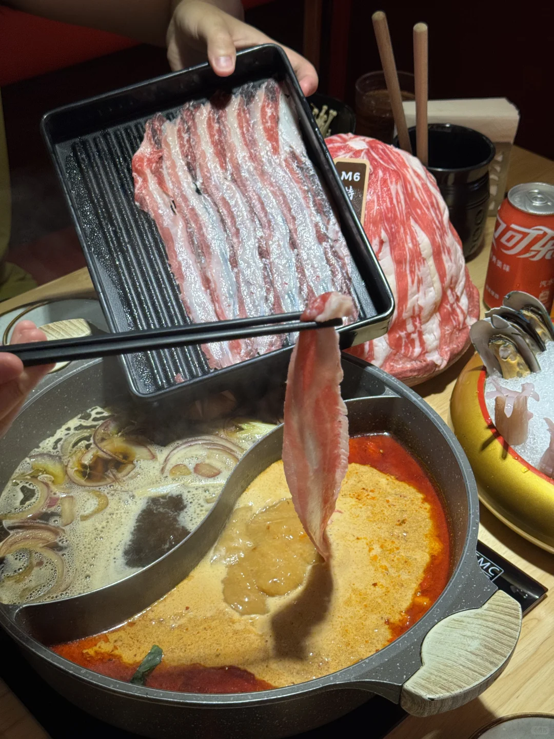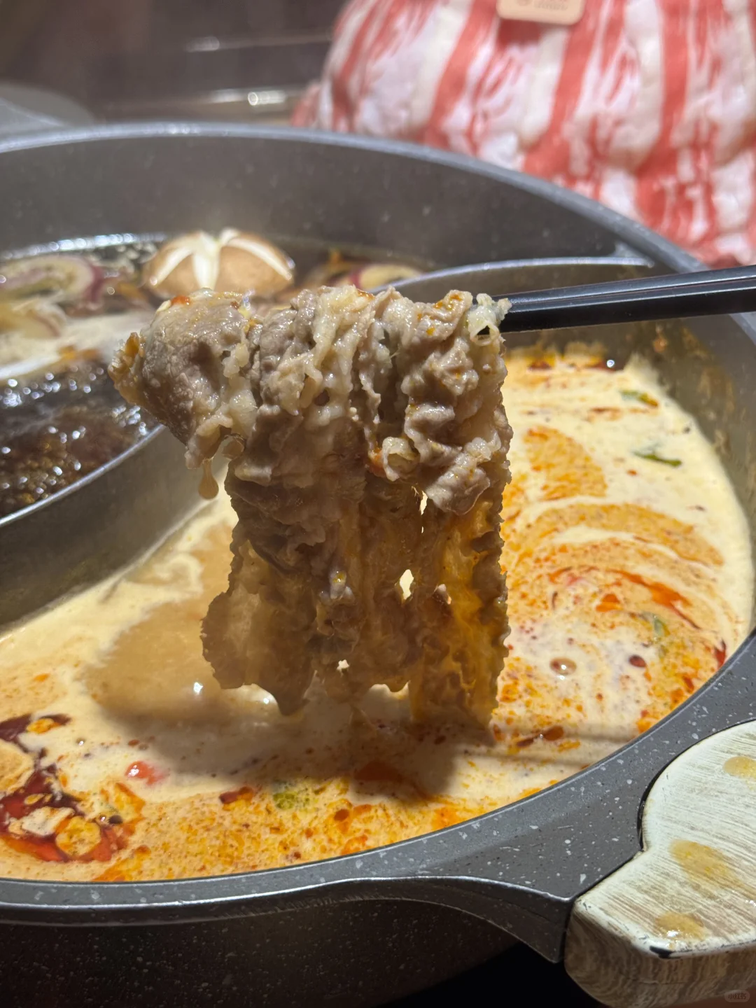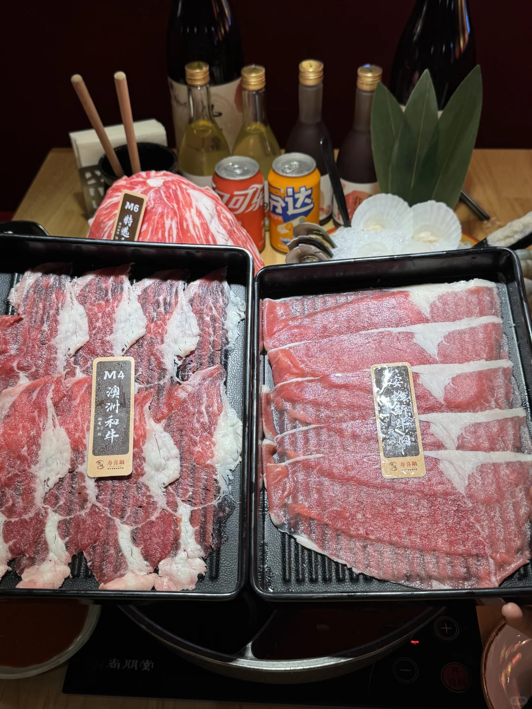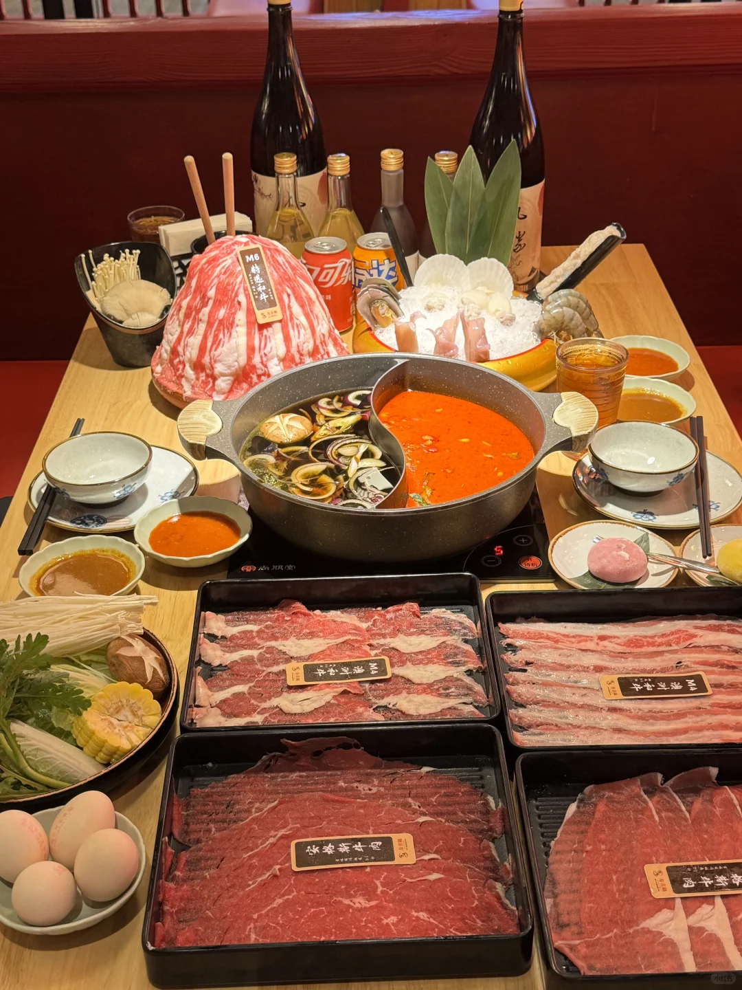 这家寿喜烧真的让人无敌满足! ✨ M6和牛雪花纹理超美,涮几秒就入口即化,炒鸡柔嫩! 还有M4和牛肉质鲜美、性价比超高,完美满足不同的需求~ 🥩两种顶级和牛放在一起,吃肉就是一种享受!再搭配双拼锅底,寿喜烧的甜口和冬阴功锅底搭配,一锅两吃的极致体验😋