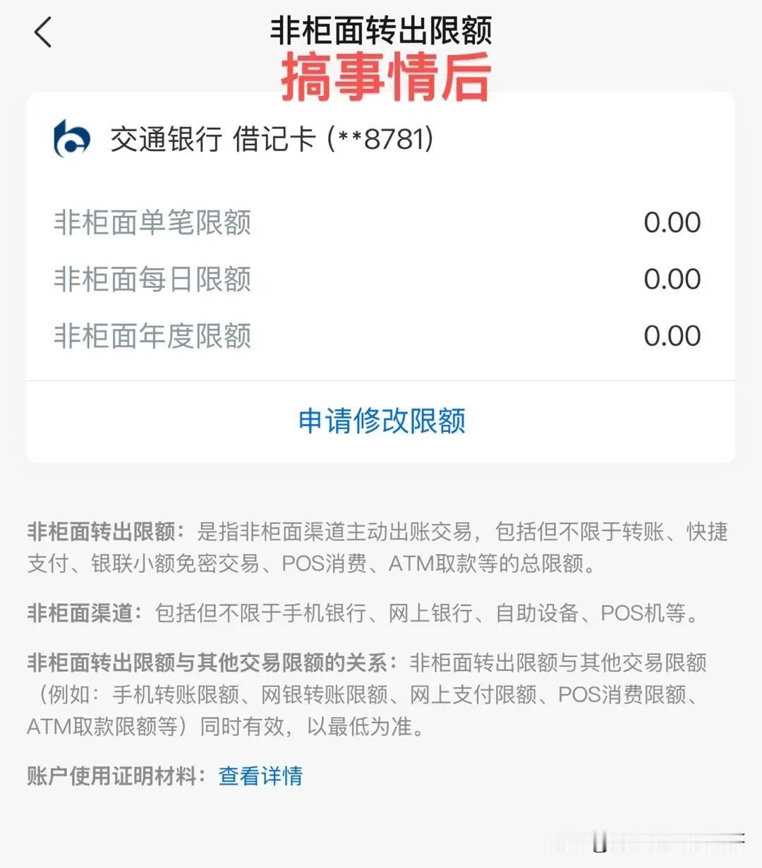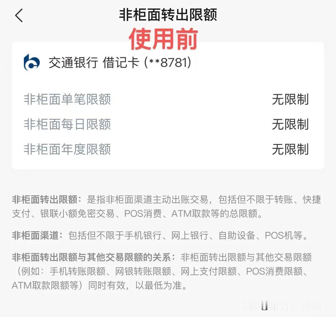 银行储蓄卡上还有有效日期?你留意了吗?不知道有多少朋友知道,银联卡上面有个有效日期,如果到期了会怎么样? 到银行办理业务时,顺便咨询了下, 网上银行,手机银行使用都没有影响,但是使用ATM机器就会受限。 啥意思? 就是//取不了钱呗。 那既然如此,为了可能日后有需要取点现金使用,那就换卡更新吧。(银行卡不能取现金真不知道是什么事) 但是,给自己添堵的事情来了: 制卡约一周,这段时间卡的功能都正常,但是会限额。需要找理财经理解除限额的功能。 看懂了吗? 正确情况是, 卡的功能正常,能收钱,但取不了钱(废话,卡都冻结要换新卡了); 手机银行不能转钱,因为被限额,多少? “0” 没错,就是一元钱都转不出去。[汗] 不慌,找理财经理。 人家的热情服务肯定能依照柜员详细对我说明的,协助解决限额问题。 结果: “亲,您“每天”要转多少,提前跟我说一下,我当天就能协助处理。” 得,自此以后,我多了位管家,坚守住本应该是我自己可以自由支配的钱💰 我不知道有多少人可以理解接受这点?#银行卡提限额# #世界国潮风#