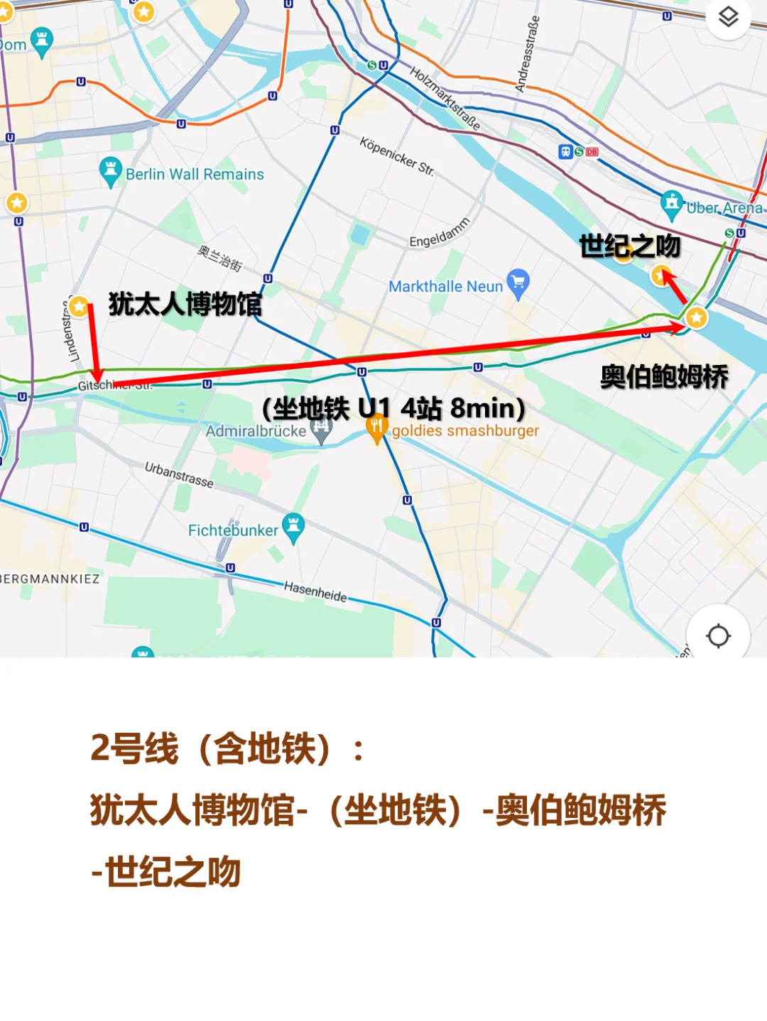 早上,先去犹太人博物馆,深入了解犹太人的历史与文化。然后,建议乘坐地铁前往奥伯鲍姆桥,体验柏林的工业风情与河边的宁静美景🌉。午餐推荐在桥附近的小餐馆,品尝地道美食。接着去看世纪之吻,知名人文地标。