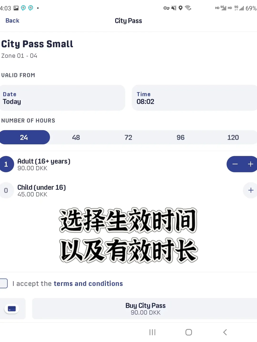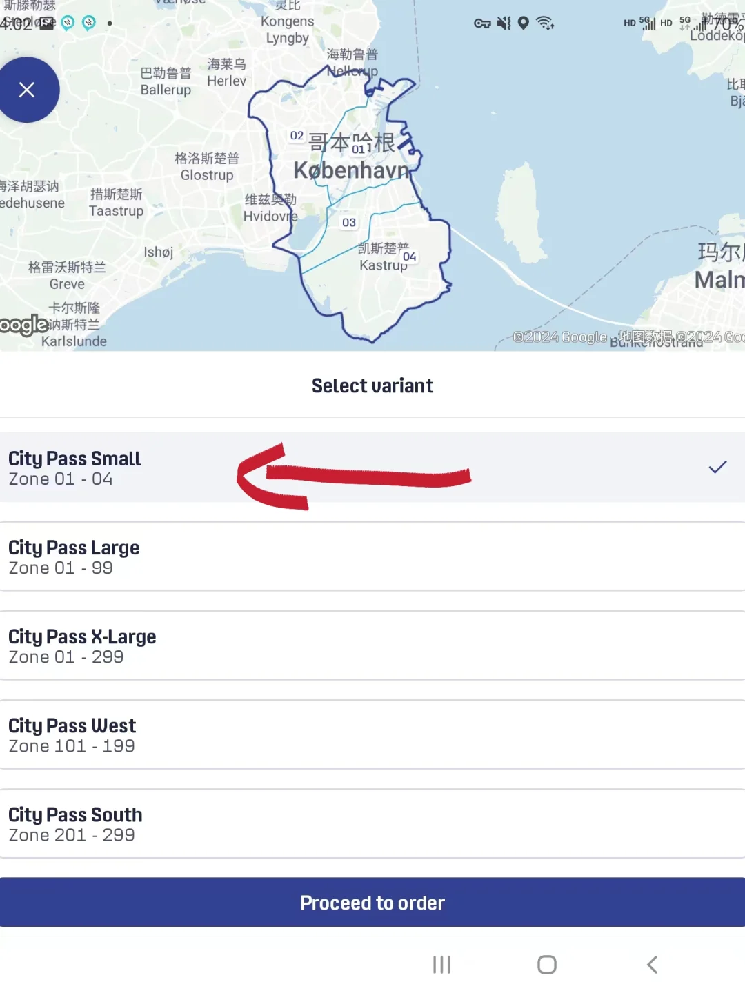 [向右R]哥本哈根的pass分为两个不同范围,small和large,区别是覆盖的范围不一样,常规的small pass如图8,它覆盖0-4区,这里市中心基本都包含了,但是到管风琴的地铁是不包含的,如果你选择了small pass 后,接着就需要选择它生效的时间,以及他的有效时长,比如24h的pass,它的价格是90 DKK,如图9