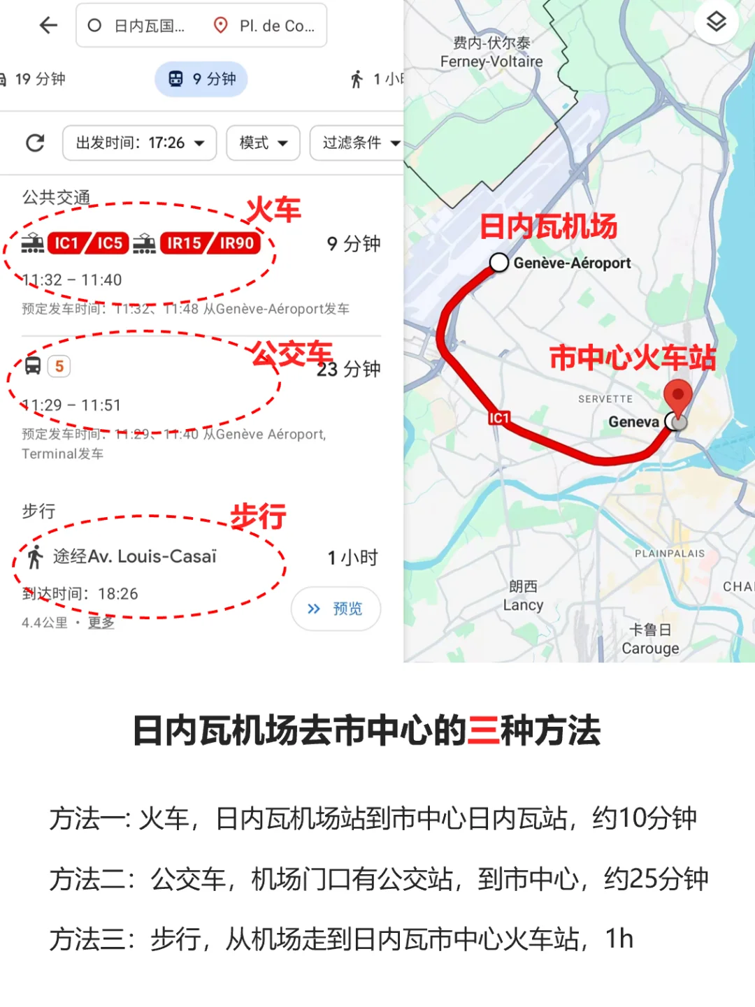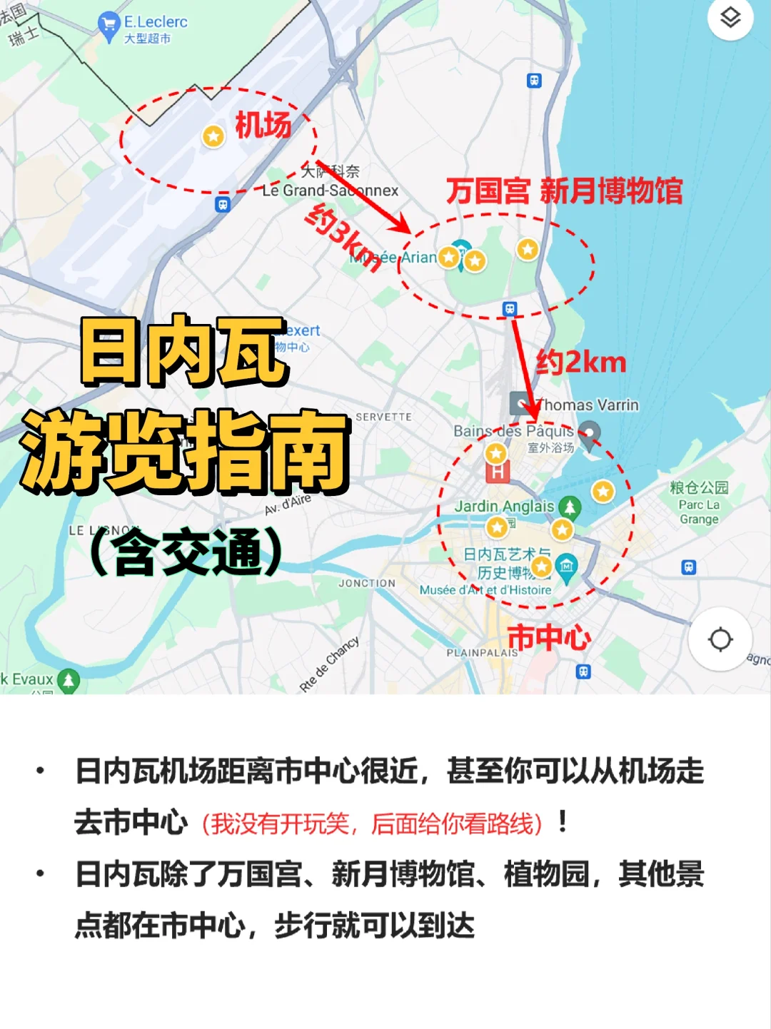 [害羞R]日内瓦机场和市区的交通往返,我在图里标注了,关于日内瓦的各个景点,他们主要集中在市中心,即便是万国宫,我觉得也是步行距离的,大家可以看图中的位置标注,具体介绍如下,大家根据兴趣选择参观吧!