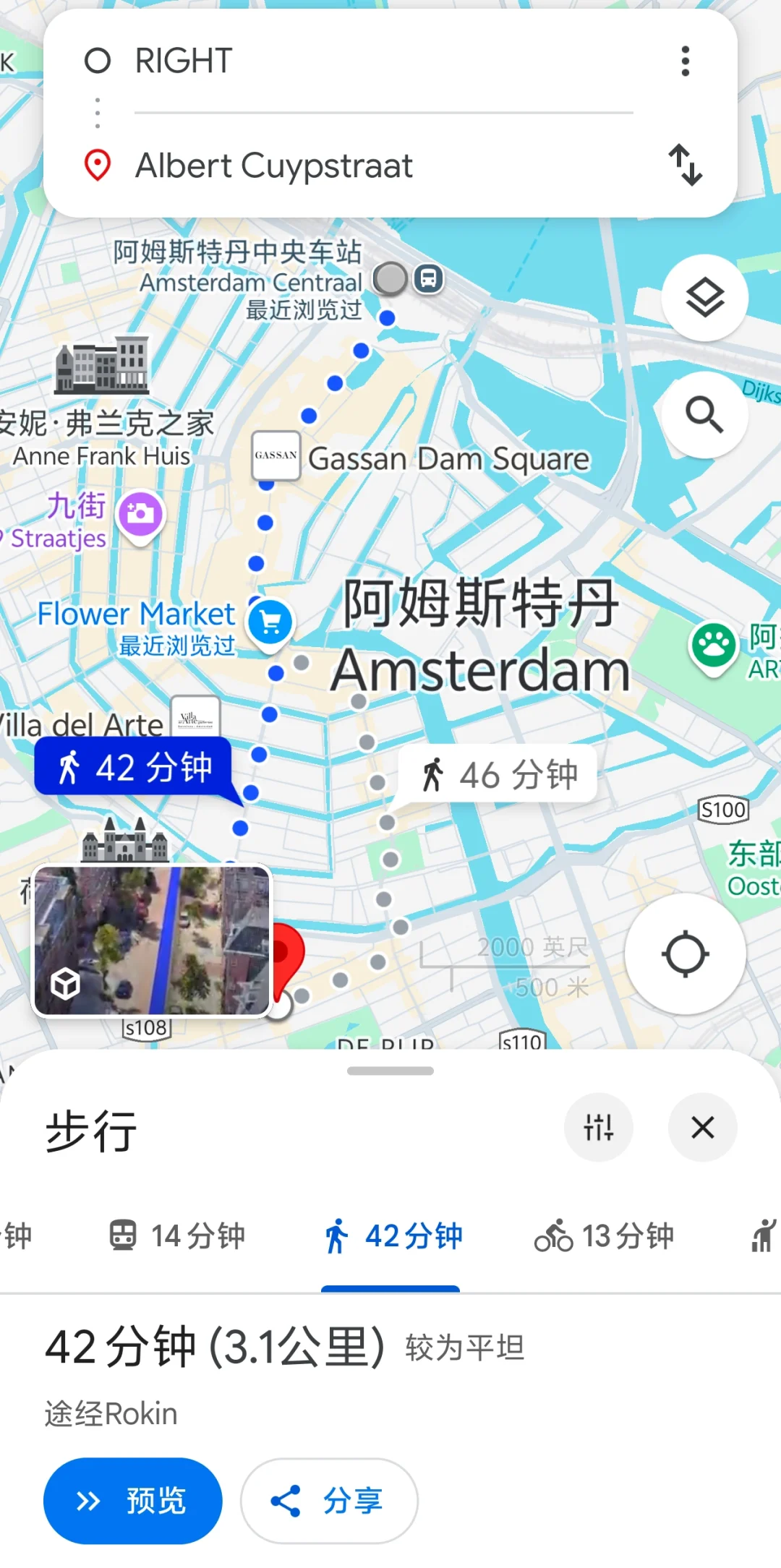 推荐两条阿姆斯特丹City Walk路线,如图1,其实阿姆斯特丹比较紧凑 从中央火车站到Albert Cuypstraat大街也就3公里,如图2,所以大家可以自己评估走路的距离。