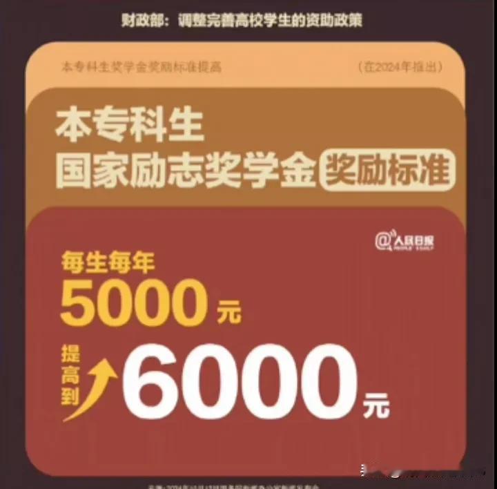 好消息!国家奖学金不仅名额提高,而且数额也提高! 本科、专科:8000元提高到10000元,人数由原来的每年6万人,提高到12万,正好翻一番! 硕士:人数由3.5万人提高到7万人,翻一番! 博士:人数由1万人提高到2万人! 这样都加起来,能拿奖学金的只有21万人,而每年的毕业生高达1000万,比例大约为2,1%,少之又少!竞争可见激烈,得有多优秀,才能拿国家奖学金! 奖学金提高了,大学生助学贷款也提高! 我认为一方面国家大规模招生,人数自然提高;另一方面国家重视人才培养,重点是优秀人才的培养!让贫寒子弟能上得起学,并且人人争先进,促优培优![祈祷][祈祷][祈祷]#记录秋日生活点滴#