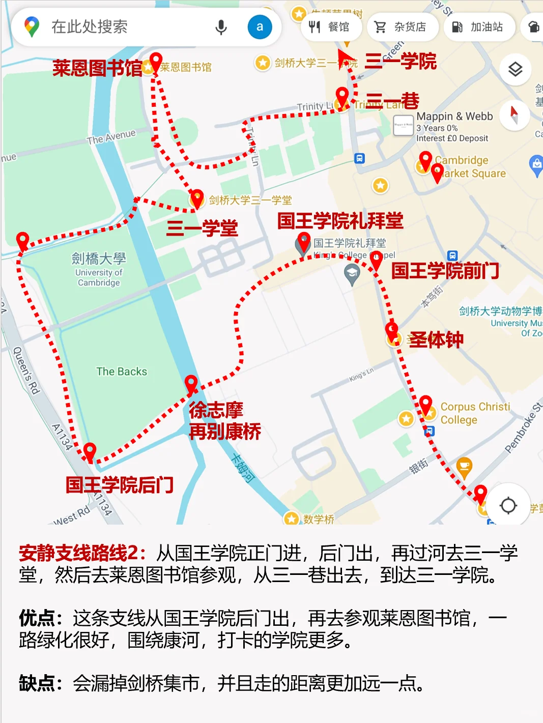 这条支线从国王学院后门出,再去参观莱恩图书馆一路绿化很好,围绕康河,打卡的学院更多。