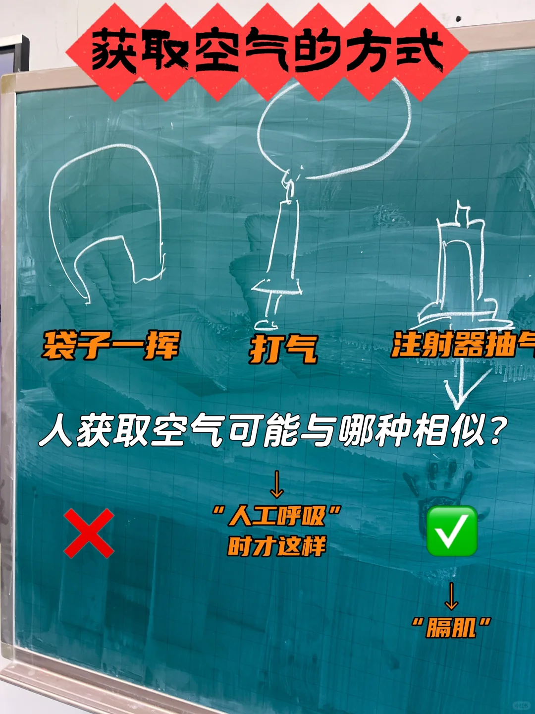 注射器往下拉,气体被抽进来了。人体中也有个注射器一样可以往下拉的结构——【膈肌】