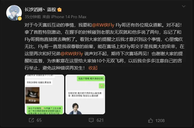 蓝桉就未与Fly拥抱发文道歉:说声对不起,拿到首胜很激动!