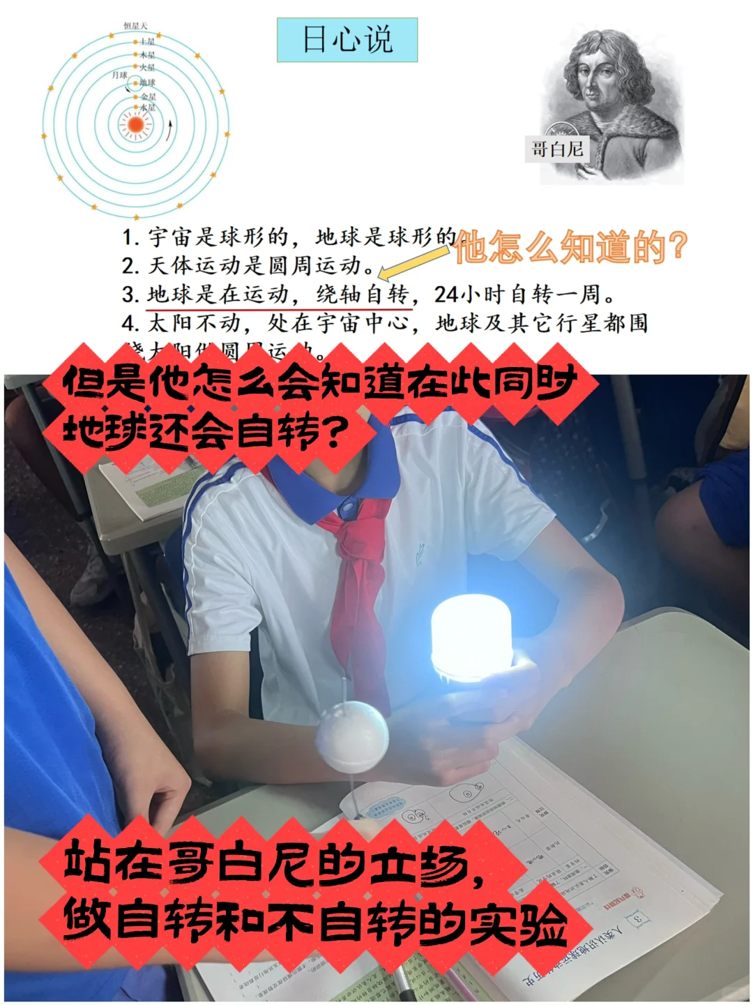 昨天临时被换课学生没带地球模型,而且他们刚上完体育课又很累。我就灵机一动在一个班用了剧本杀的方式上这节课,正好有很多学生下意识地举右手,我就把他们分配到教会阵营;举左手人数少的给他们分到哥白尼阵营要保护自己不被教会迫害。根据书上的资料和找的视频资料,让他们互相辩论。效果也很好。最后还跟他们说,宇宙是无边无际的,其实不要觉得大家都相信的东西一定就是真的,永远要有自己的思维,多问个为什么。