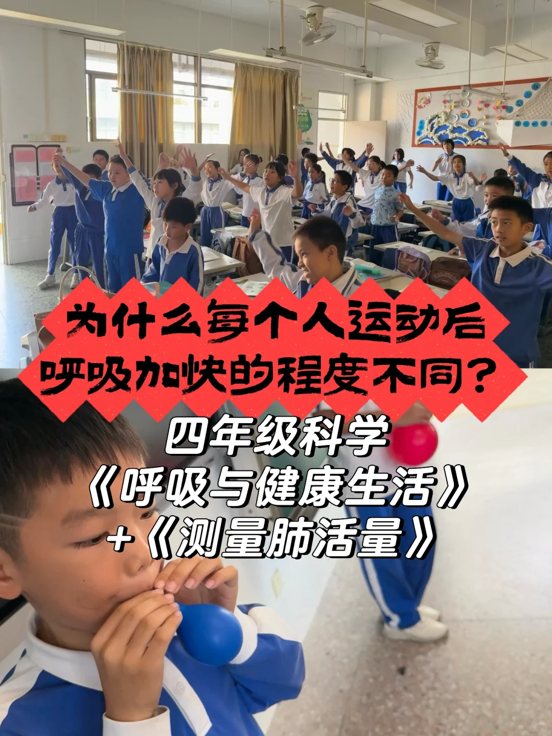 发现《呼吸与健康生活》中运动后呼吸的测算,很适合用于《测量肺活量》的导入! [集美R]为什么每个人每分钟呼吸次数不同、呼吸加快的程度也不同? 学生的研讨回答既有“数数误差”,有“没认真跳”,有“每个人高矮胖瘦、体质不同”,还有“肺的大小不同”[得意R] 🫁四年级科学-《呼吸与健康生活》+《测量肺活量》 [一R]呼出气体与吸入气体的变化 发现这里需要理解的概念都是环环相扣的。 🔵理解人体以及人身上的【各个细胞】都需要【氧气】,利用氧气来生成【能量】——人呼吸就是为了获取氧气 氧气被消耗后就会被转化为【二氧化碳】和【水蒸气】 ✅懂了氧气和二氧化碳的含量变化 🔵靠肺泡周围毛细血管中的血红细胞,充当“派送员”和“收垃圾员”的角色,把氧气派送到身体的各个角落,又把各个角落产生的二氧化碳“垃圾”收了给回肺部 ✅理解【气体交换】和【“中转站”】 🔵人供氧不足会有的反应 ✅能答出“运动后呼吸加快”的原因 [二R]每个人运动后呼吸加快的程度相同吗? 因为大家都知道自己运动后呼吸会加快,所以就把一个人的纵向比较,改成了人与人之间的横向比较。 [星R]帮助理解每个人【体质不同】运动起来需要的氧气不同的说法:“让一个李xx(男)动起来需要的能量和让一个赵xx(女)动起来的能量相同吗?” [三R]“肺活量”初测 前一环节研讨引入的“每个人一口气的量不同”,其实就是“肺活量”的影子。 🎈吹气球比赛初步看到两人“一口气”的量确实是不同的,而下节课要做的,就是用带有刻度的“气球”,把肺活量测出来。