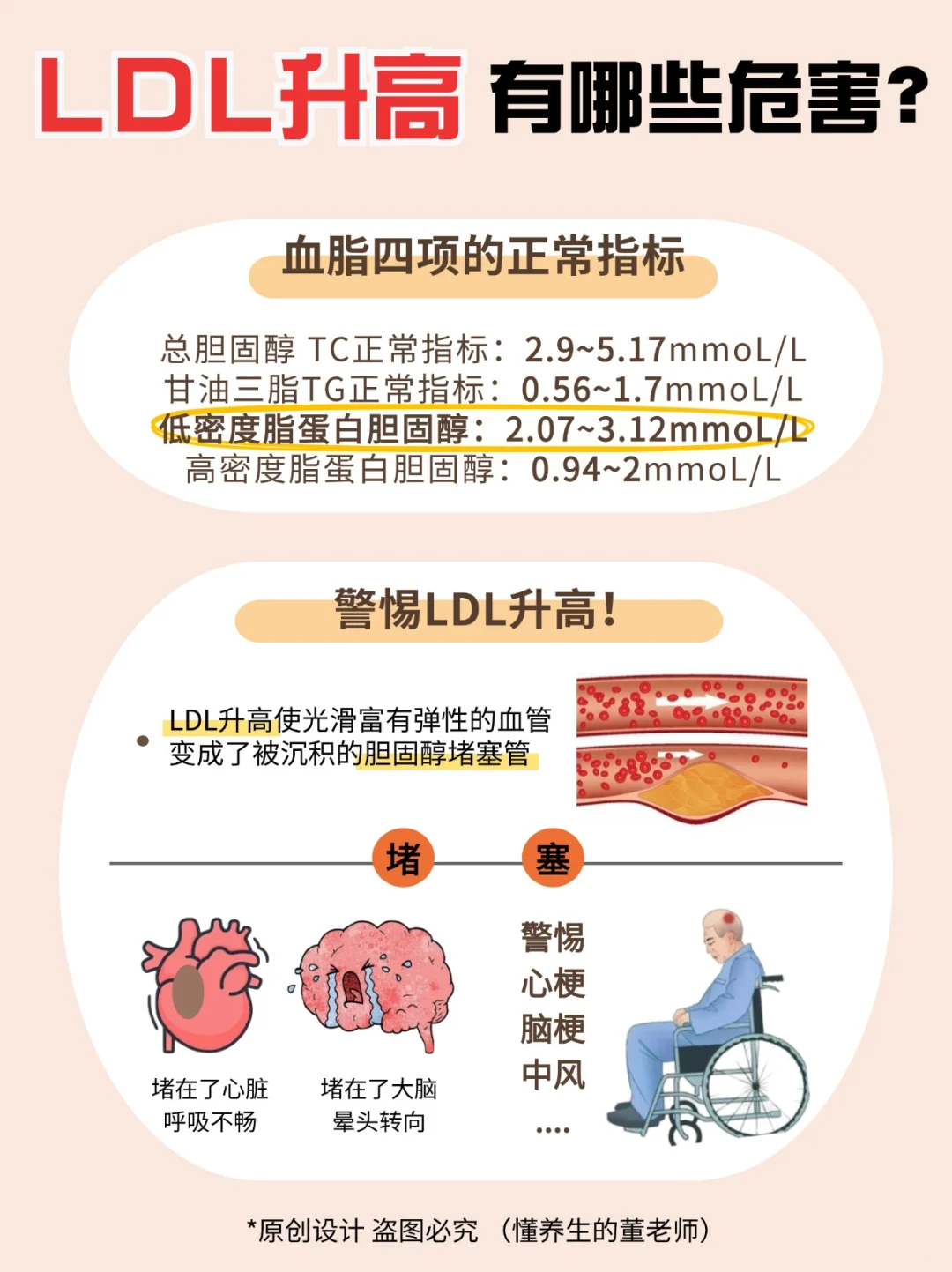 图二给大家介绍了血脂四项的正常指标📈以及LDL-C升高的危害!🚨