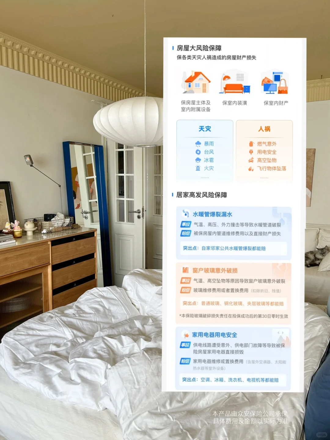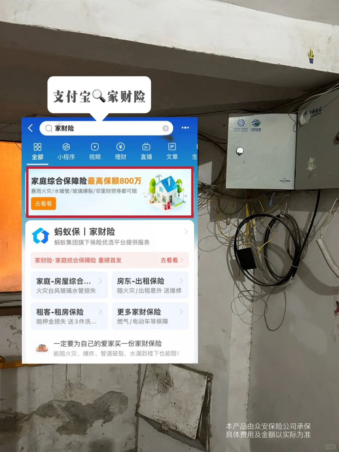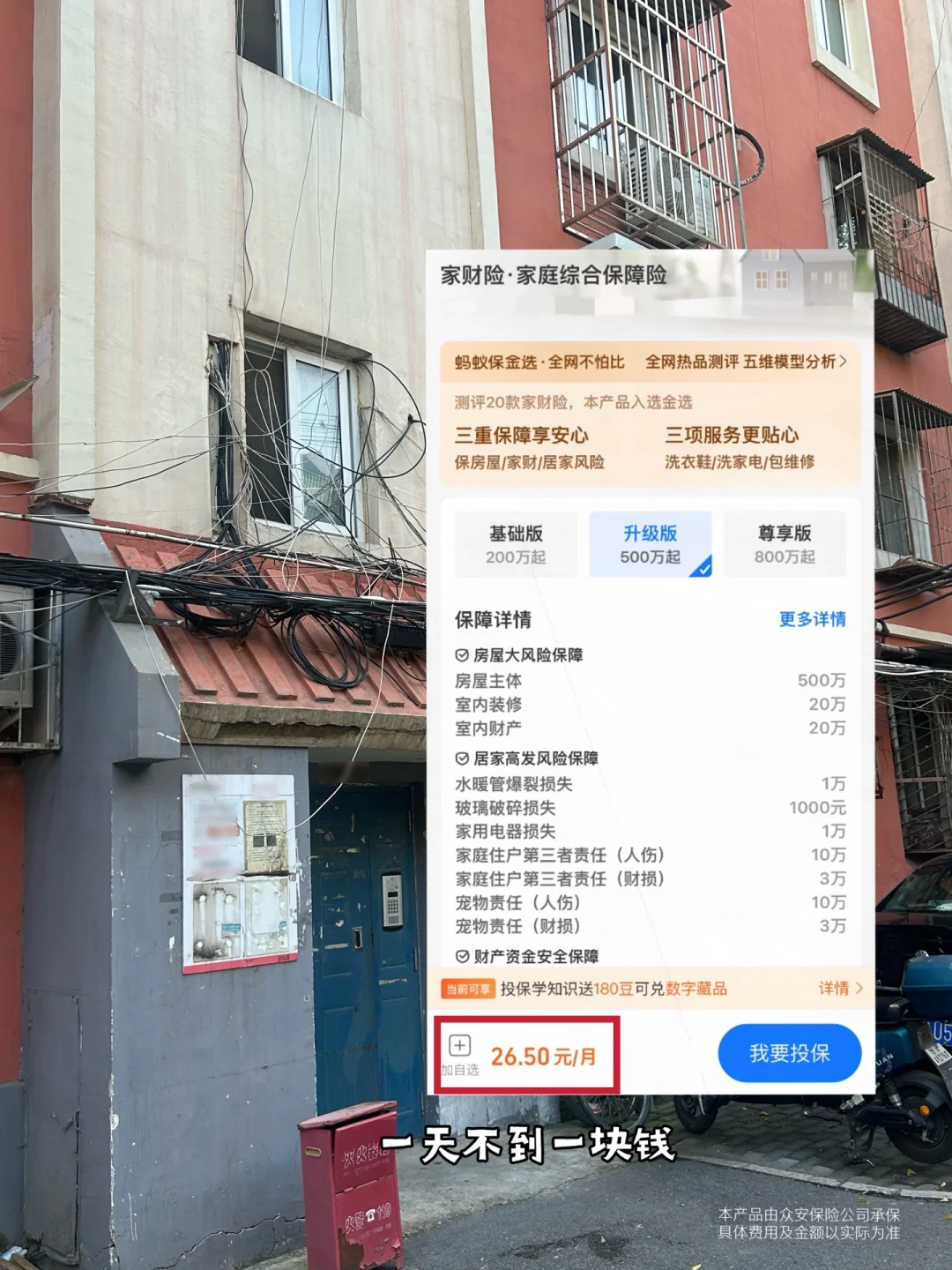 🏡 搬进新家一年半了吧,经过自己设计装修,把普普通通甚至有点破烂的房子变身为温馨有趣的家~ 说起老破小,大家印象里都是电线乱搭,电箱老化,管道老旧,垃圾成堆,邻里吵闹,隔音差 ,痞老板乱跑,绿化差劲,停车难等诸多问题。 当初装修拆栏杆也被家长拦着,说能防盗,破旧的小区让人总觉得处处是风险隐患🔥。 家里可以任由自己改造提升,但小区电线电箱问题却鞭长莫及。加上家里电器不少,真担心哪天电线短路电器爆炸的情况;近期刷到刘亦菲代言了蚂蚁保,我也研究了下保险,发现支付宝上有一款🌟【家财险-家庭综合保障险】很适合我们这种老破小改造的房子,在平台上买很方便也有保障,☺️我就入了一份。 家财险一天不到一块钱,就可以保各项居家高发风险—— [一R]像小区旧电箱供电线路短路导致家用电器损毁、气温/高压导致水暖管爆裂、玻璃意外破裂,燃气意外等; [二R]漏水、火灾高空坠物造成的邻居人财伤损、入室盗抢、资金被盗用,均能赔付; [三R]暴雨火灾等一系列自然灾害造成的房屋损失赔付更是高达百万。 像我们家这种老破小,家财险真是帮大忙了,我直接选了500万保额,给自己满满的安心。 希望我们都能幸运的不碰上这些意外! 光赠送的生活服务也是非常香的,像衣鞋清洗一次也大几十,空调油烟机,管道维修等更是百元起,现在都可以🆓预约了,约两次一年的保费都回来了。 - 在得到保障之后,老破小中的烟火气,也许能平凡踏实。 —