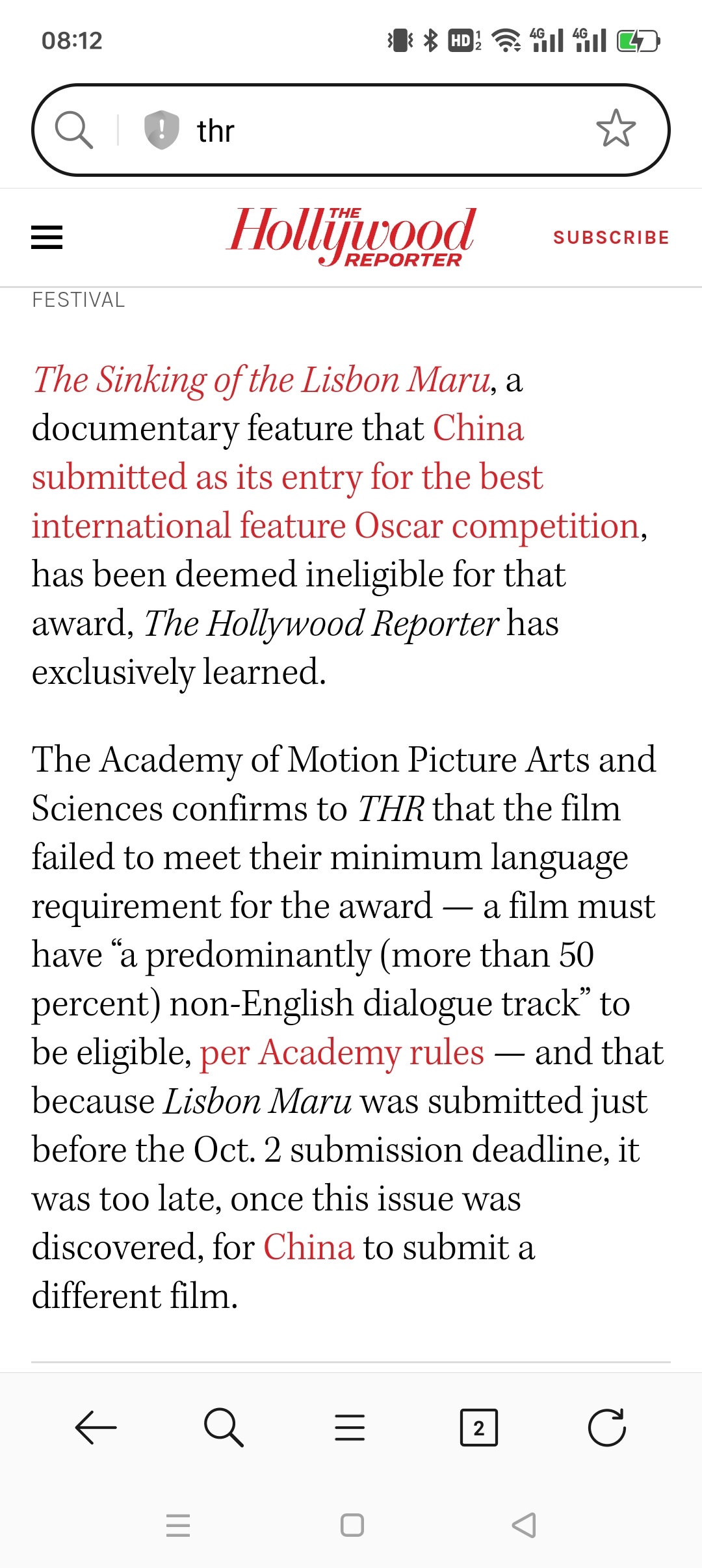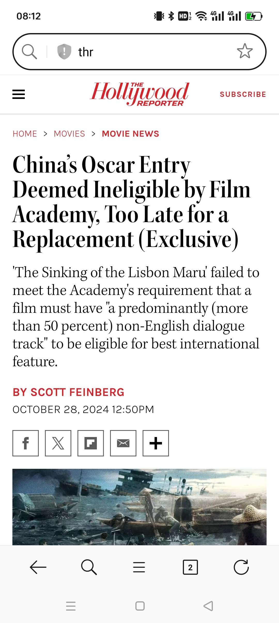 THR报道:中国内地选送的纪录片《里斯本丸沉没》无缘参加明年『奥斯卡最佳国际影片』的角逐。
