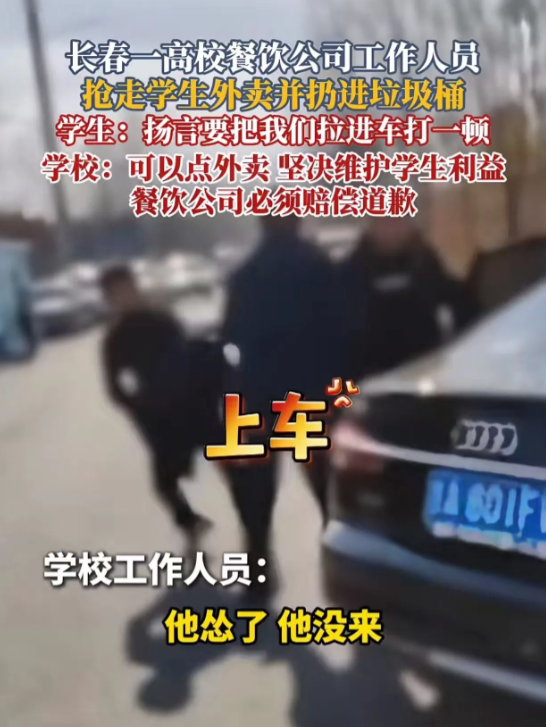 太嚣张了!长春,学校餐饮公司为了不让学生点外卖,抢走学生外卖扔垃圾桶,还扬言要把学生拉进车里打一顿!学校:坚决维护学生利益 要求餐饮公司赔偿道歉!网友:不是道歉,而是取消该公司资格,校长开除!