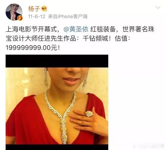 上海电影节开幕式上,杨子亲自为黄圣依戴上的钻石项链,据说估值也有两亿,但杨子眼里只有钻石,没有黄圣依。