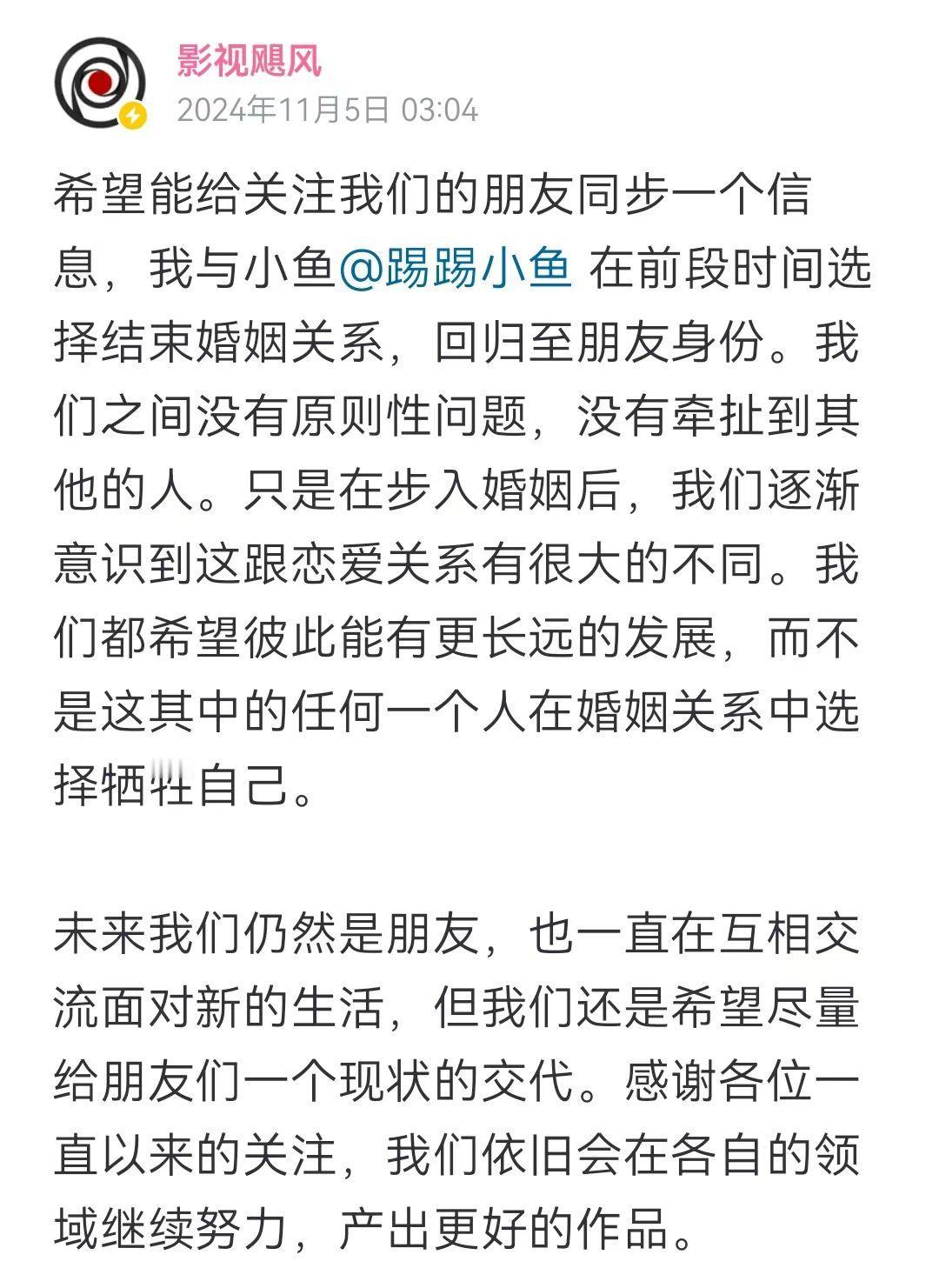 全网粉丝超千万博主“影视飓风”离婚,网友:离婚这个赛道还是太拥挤了。 在11月5日凌晨3点,“影视飓风”创始人Tim,在社交平台公开宣布自己选择离婚的信息,说“没有原则性问题”,大多数网友还是选择尊重祝福。 Tim作为影视飓风门面,说停容易,但是一公司人的生计,到频道粉丝、员工、亲友所承载的理想,没人愿意见到大厦崩塌。 因果同时存在,或许因为领了证,强化了双方的使命感,可既然能领证,也是曾经美好的成果,结、离登记就是张证,生活总是要继续的。
