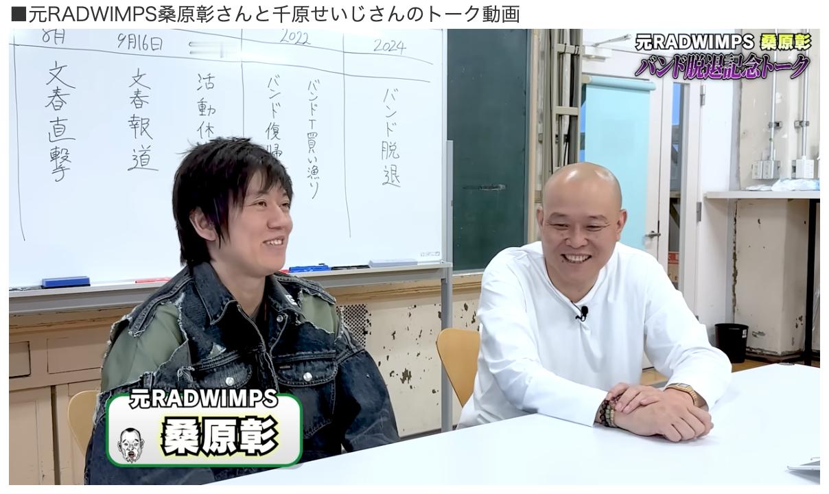 10月17日,39岁的吉他手桑原彰(くわはら・あきら)宣布脱离摇滚乐队“RADWIMPS”,他在“千原兄弟”千原せいじ(本名:千原靖史,54岁)的YouTube频道“せいじんトコ”(注册用户:41.6万人)中出现,谈及三年前的不伦风波及乐队脱退的内幕,引发了网络上的热议。