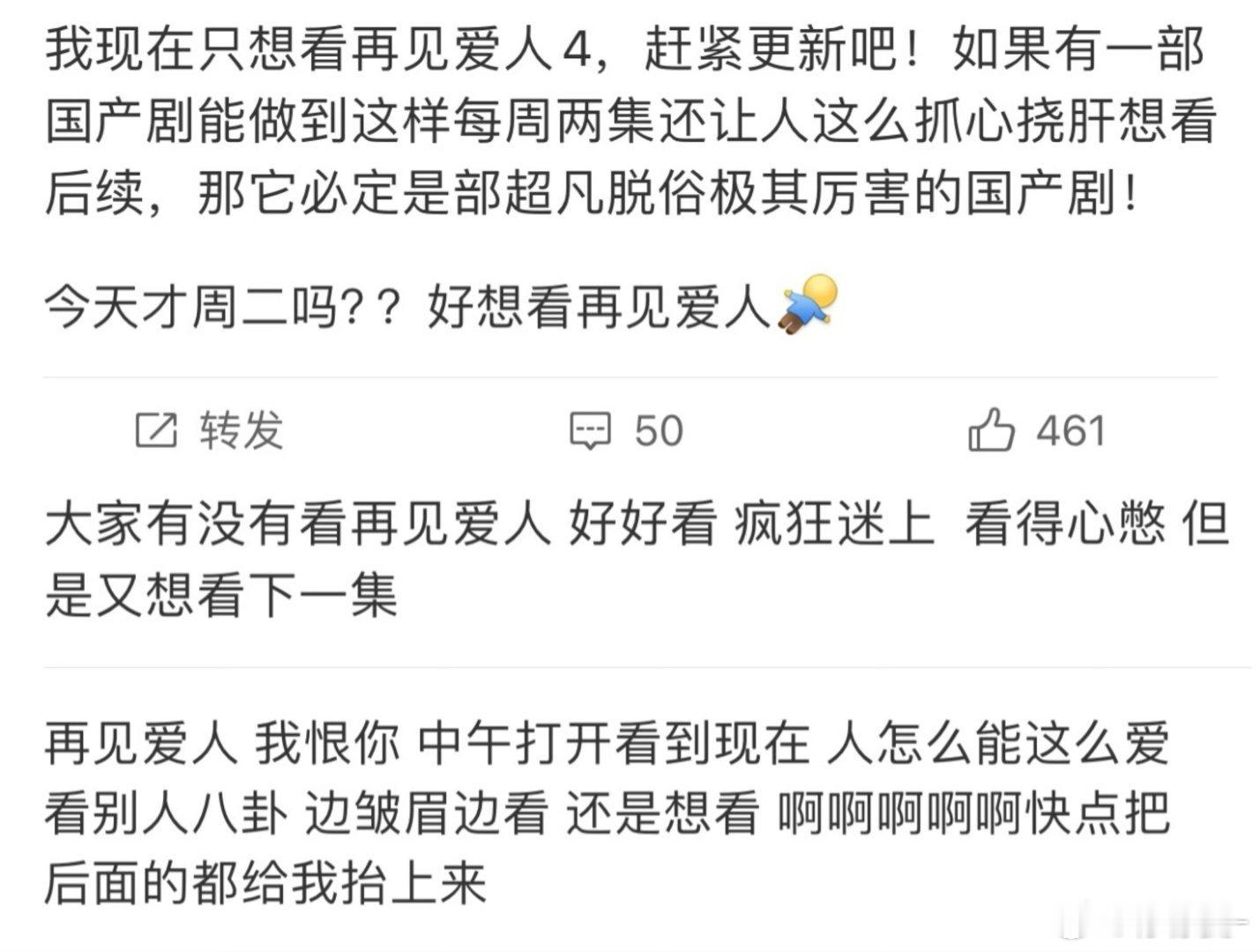 #再见爱人重新定义疯狂星期四#确实,这档节目以其真实、深入的探讨和精彩的嘉宾表现,赢得了很多观众的喜爱。每一集都让人揪心又期待,仿佛跟着嘉宾们一起经历了他们的情感纠葛和成长历程。