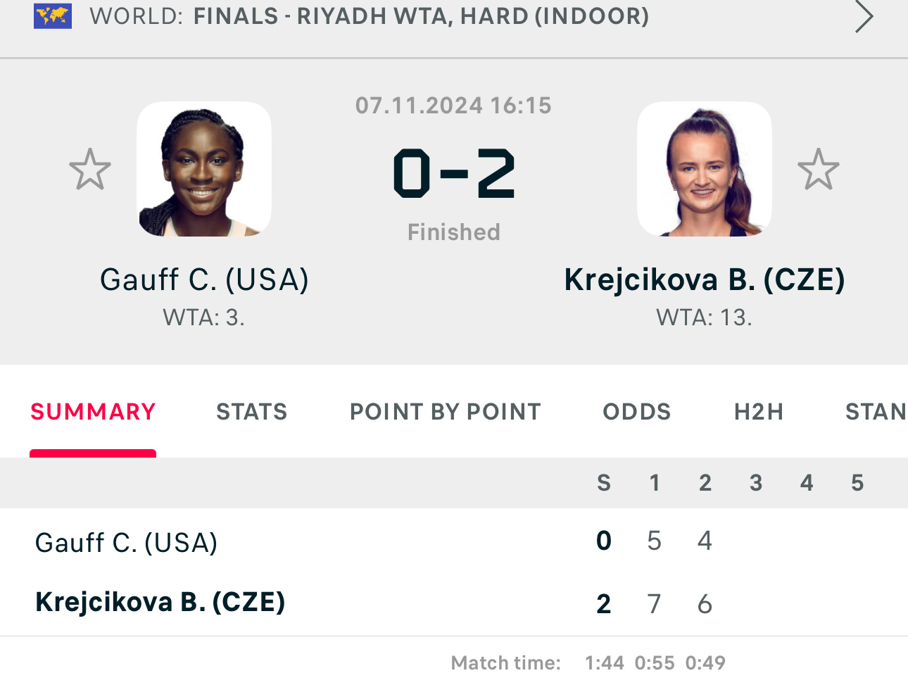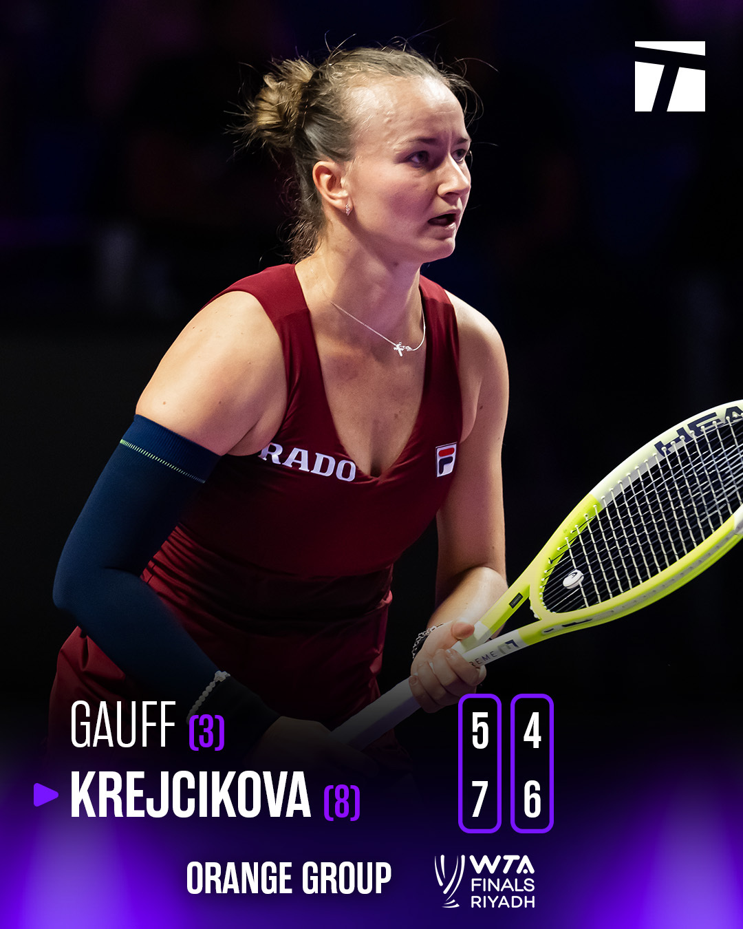 高芙关键时刻破发点送双误,克雷茨科娃挽救4个破发点后守住发球胜赛局,以7-5、6-4力克高芙,挤掉斯维亚泰克,与高芙携手出线!
