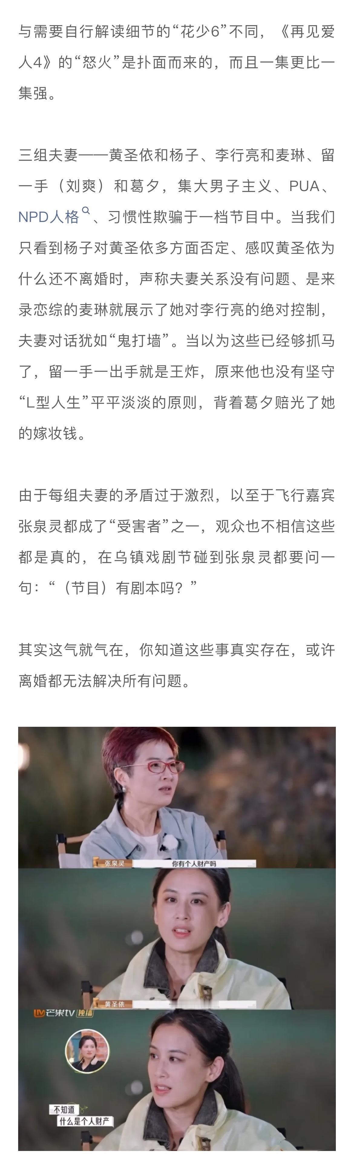 围绕《再见爱人4》的讨论之所以还集中在嘉宾本身,是因为这档节目的出发点就是去呈现感情生活中的问题,说白了,你我都是抱着看问题的诉求进来的。而且节目中就有帮观众“疏通乳腺”的人:杨子的“克星”留几手、不留情面的Papi酱、一针见血的黄执中。