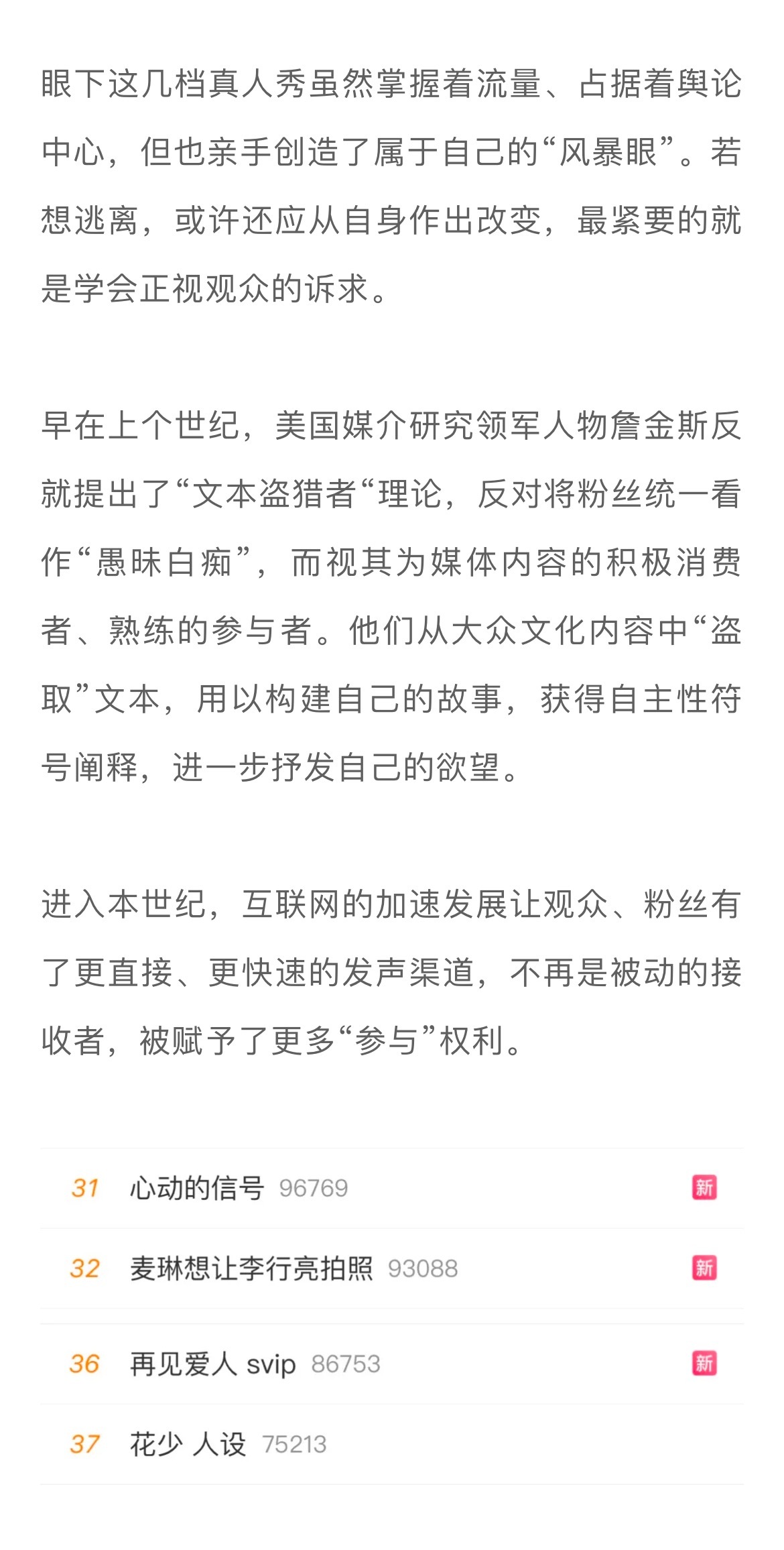 早在上个世纪,美国媒介研究领军人物詹金斯反就提出了“文本盗猎者“理论,反对将粉丝统一看作“愚昧白痴”,而视其为媒体内容的积极消费者、熟练的参与者。他们从大众文化内容中“盗取”文本,用以构建自己的故事,获得自主性符号阐释,进一步抒发自己的欲望。进入本世纪,互联网的加速发展让观众、粉丝有了更直接、更快速的发声渠道,不再是被动的接收者,被赋予了更多“参与”权利。