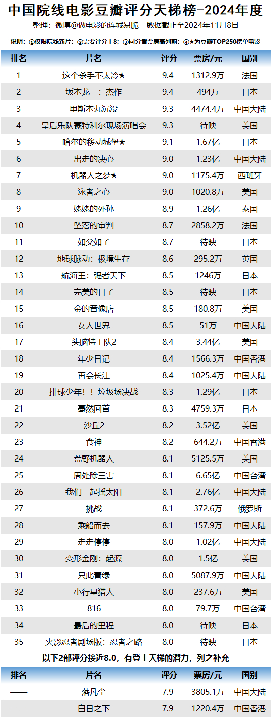 然而,今年有个很怪的现象是,这些好片即使好不容易引进上映了,也没能获得应有的关注。豆瓣9分+的《这个杀手不太冷》《坂本龙一:杰作》《泳者之心》《机器人之梦》《坠落的审判》,8分+的《年少日记》《白日之下》《乘船而去》的票房都挺惨淡的,根本无法与影片的口碑相匹配!