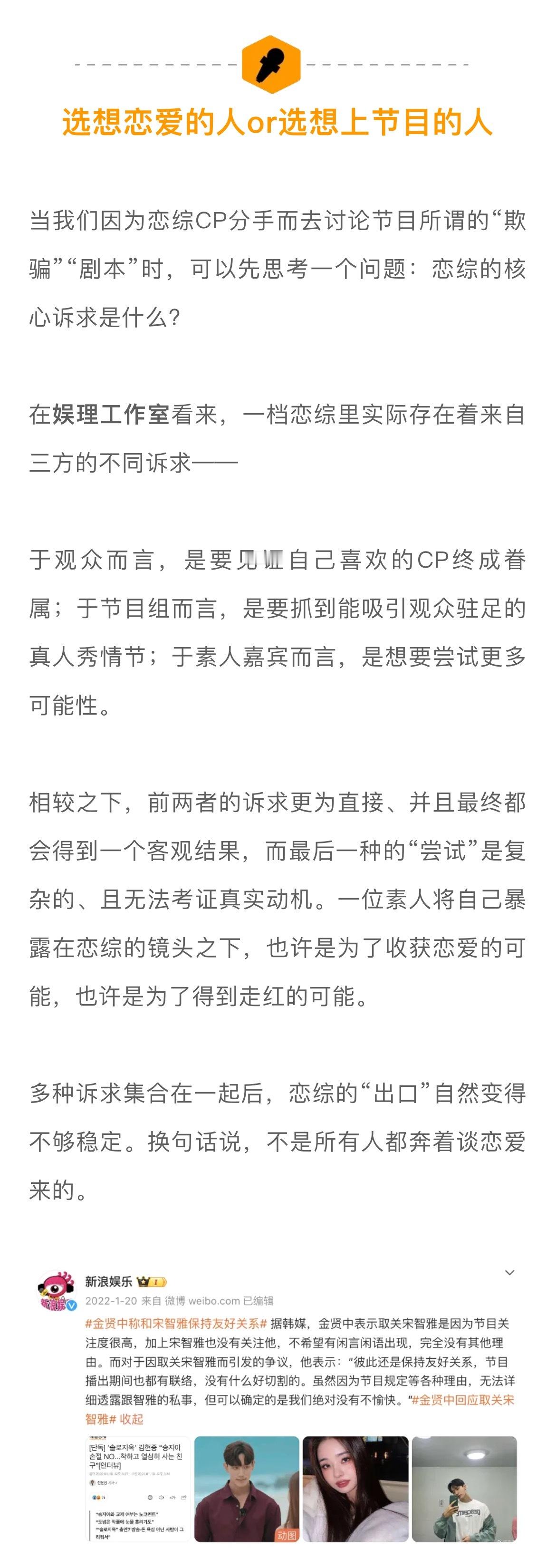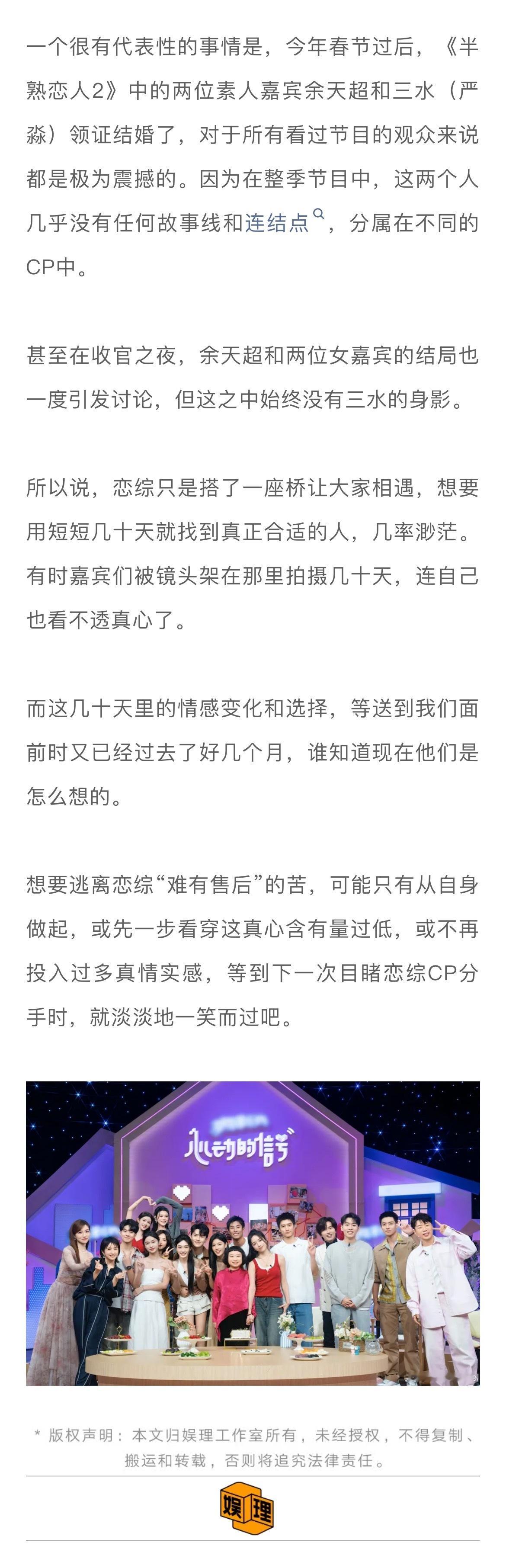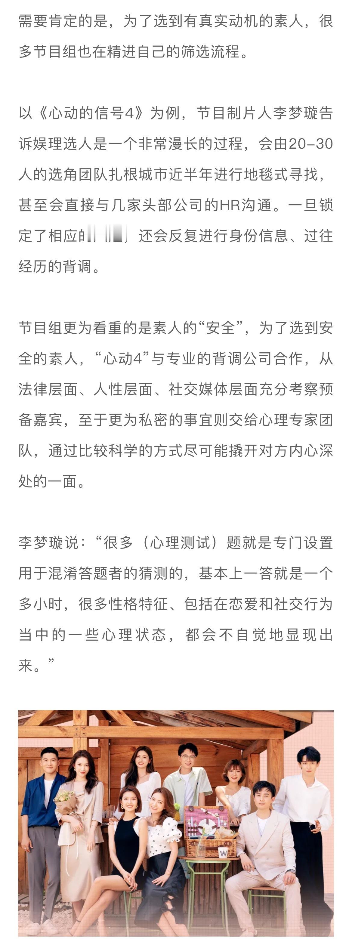 #在恋综嗑真CP有多难##上恋综的人是不是来谈恋爱的# 当我们因为恋综CP分手而去讨论节目所谓的“欺骗”“剧本”时,可以先思考一个问题:恋综的核心诉求是什么?比如为了选到有真实动机的素人,很多节目组也在精进自己的筛选流程。以《心动的信号4》为例,节目制片人李梦璇告诉娱理工作室选人是一个非常漫长的过程,会由20-30人的选角团队扎根城市近半年进行地毯式寻找,甚至会直接与几家头部公司的HR沟通。一旦锁定了相应的人选,还会反复进行身份信息、过往经历的背调。