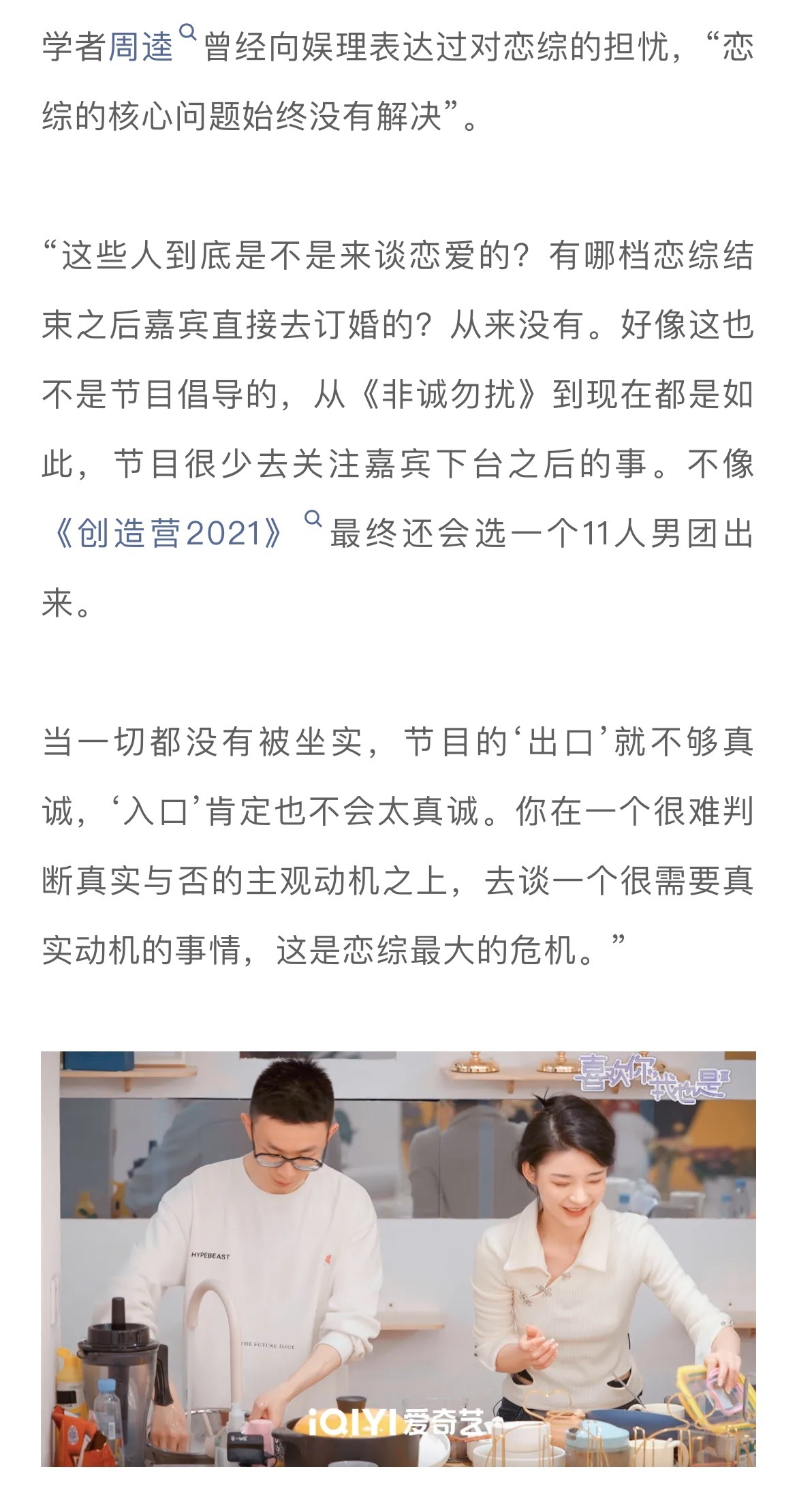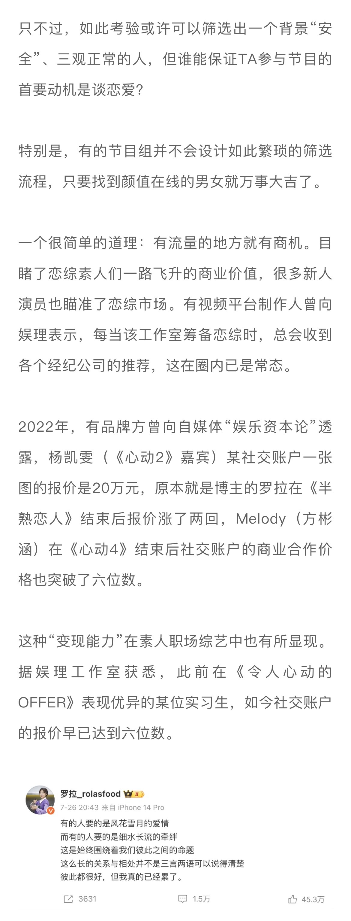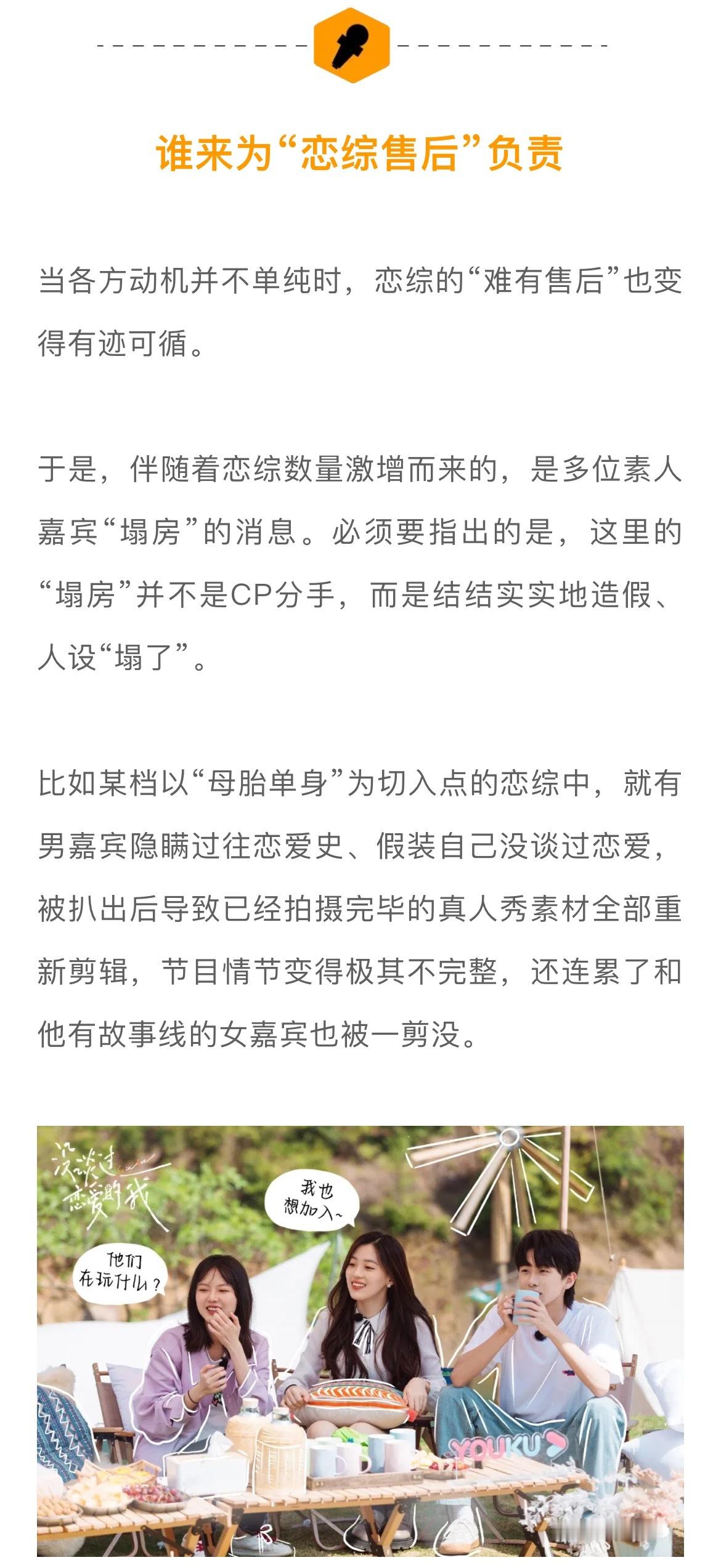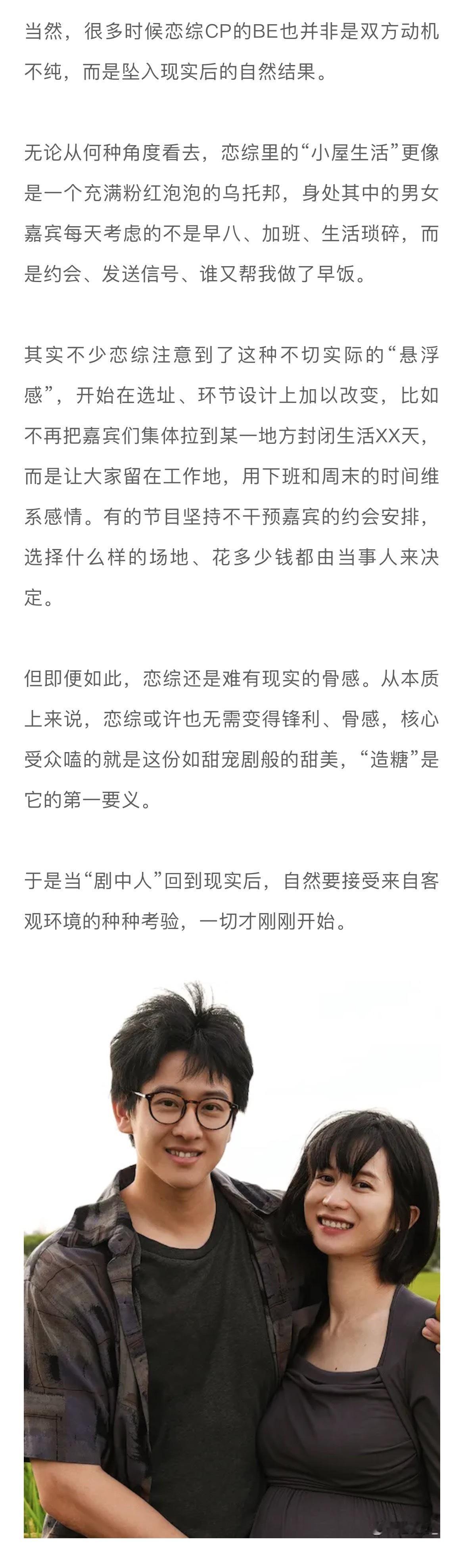 #在恋综嗑真CP有多难##上恋综的人是不是来谈恋爱的# 当我们因为恋综CP分手而去讨论节目所谓的“欺骗”“剧本”时,可以先思考一个问题:恋综的核心诉求是什么?比如为了选到有真实动机的素人,很多节目组也在精进自己的筛选流程。以《心动的信号4》为例,节目制片人李梦璇告诉娱理工作室选人是一个非常漫长的过程,会由20-30人的选角团队扎根城市近半年进行地毯式寻找,甚至会直接与几家头部公司的HR沟通。一旦锁定了相应的人选,还会反复进行身份信息、过往经历的背调。