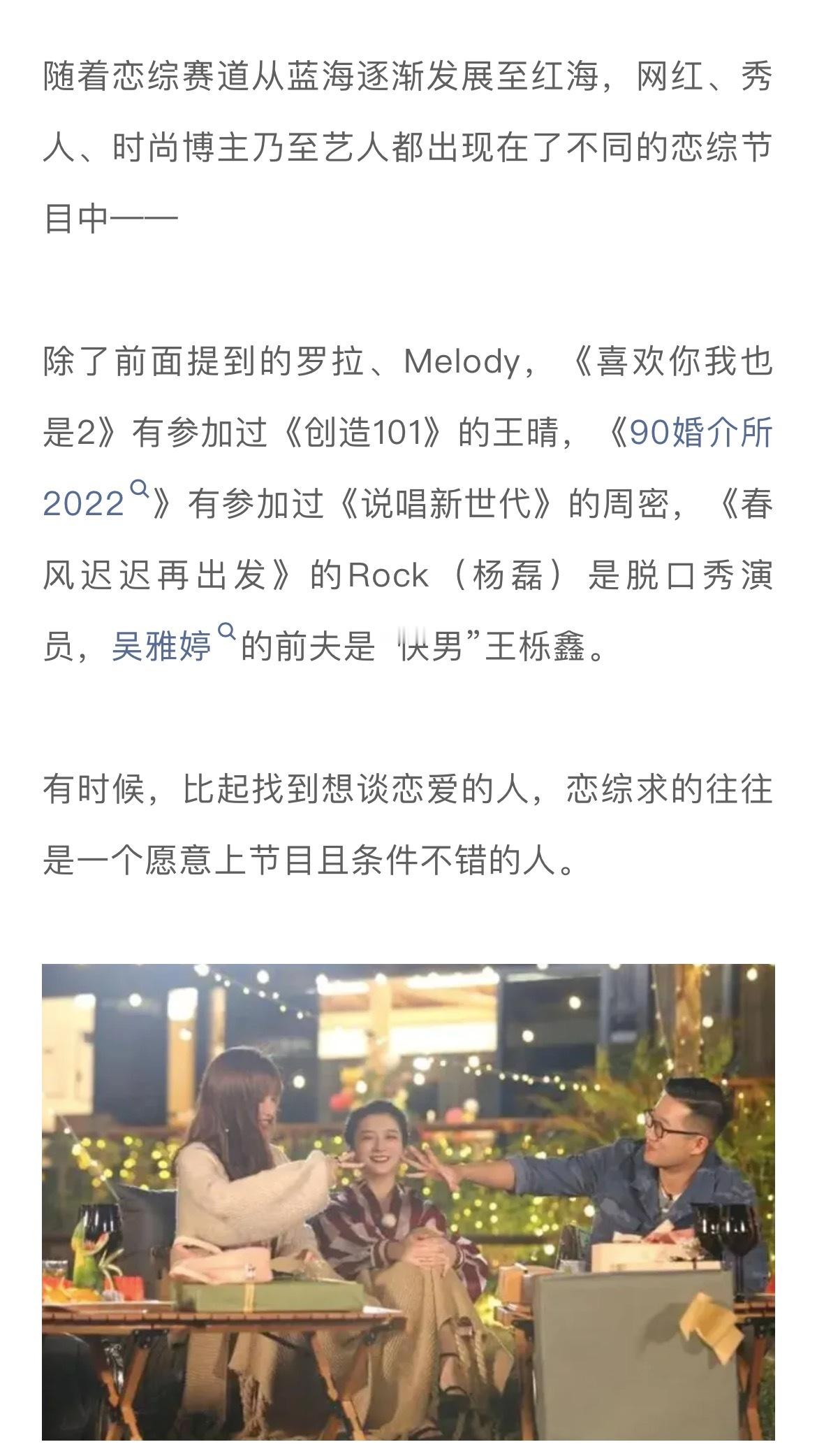 随着恋综赛道从蓝海逐渐发展至红海,网红、秀人、时尚博主乃至艺人都出现在了不同的恋综节目中,比如《喜欢你我也是2》有参加过《创造101》的王晴,《90婚介所2022》有参加过《说唱新世代》的周密,《春风迟迟再出发》的Rock(杨磊)是脱口秀演员,吴雅婷的前夫是“快男”王栎鑫。有时候,比起找到想谈恋爱的人,恋综求的往往是一个愿意上节目且条件不错的人…#娱理锐评#↓