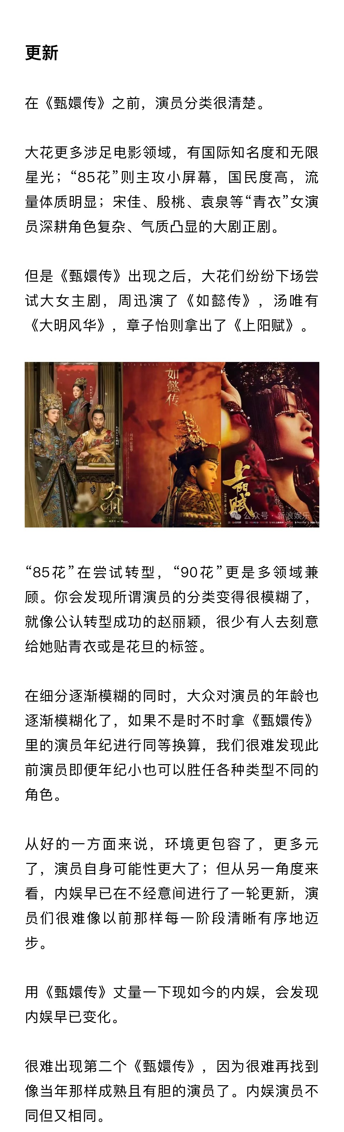 用《甄嬛传》丈量一下现如今的内娱,会发现内娱早已变化。很难出现第二个《甄嬛传》,因为很难再找到像当年那样成熟且有胆的演员了。
