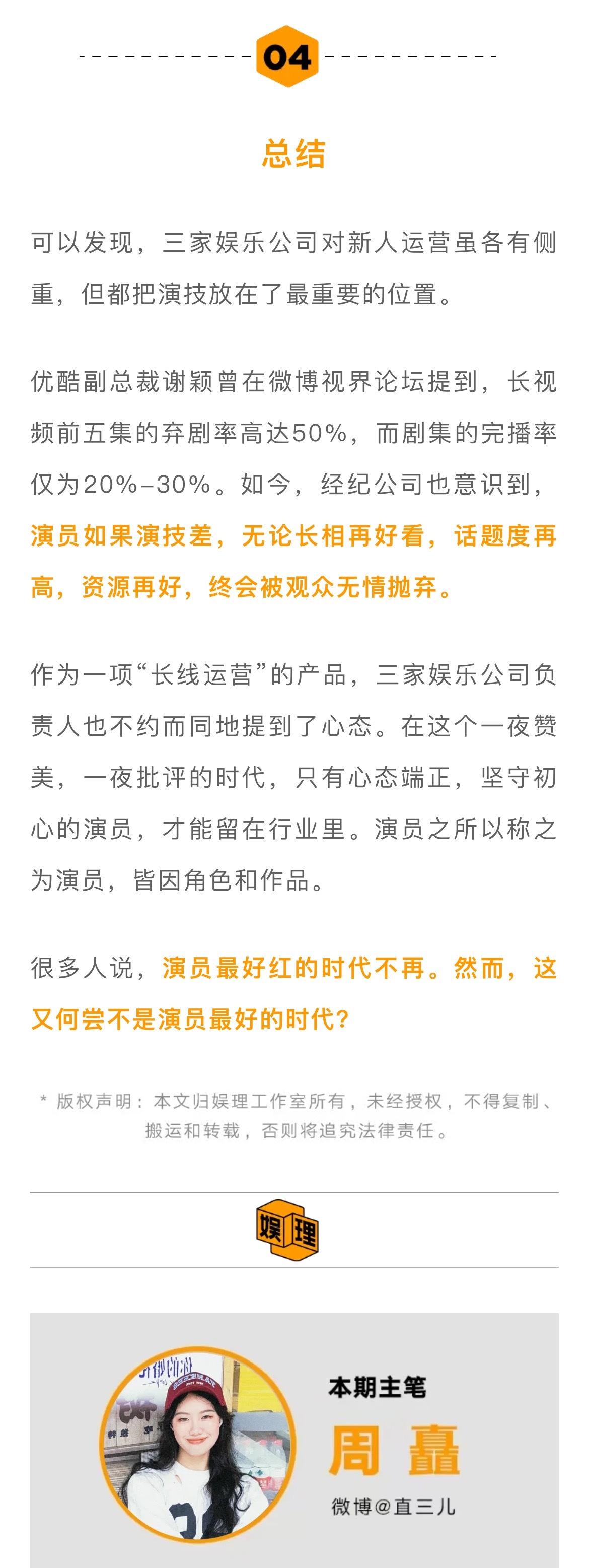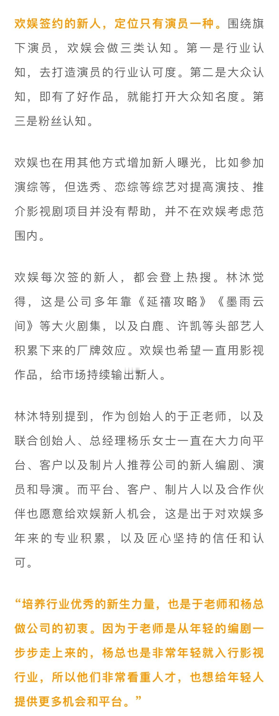 欢娱每次签新人都能引发热议。欢娱影视经纪总监林沐觉得,这是公司多年靠《延禧攻略》《墨雨云间》等大火剧集,以及白鹿、许凯等头部艺人积累下来的厂牌效应。其中欢娱的舆情应对课还会教艺人如何面对负评“…要想清楚你的定位是什么,想输出的是什么,要不然很容易被外部舆论带偏,做出错误判断。”