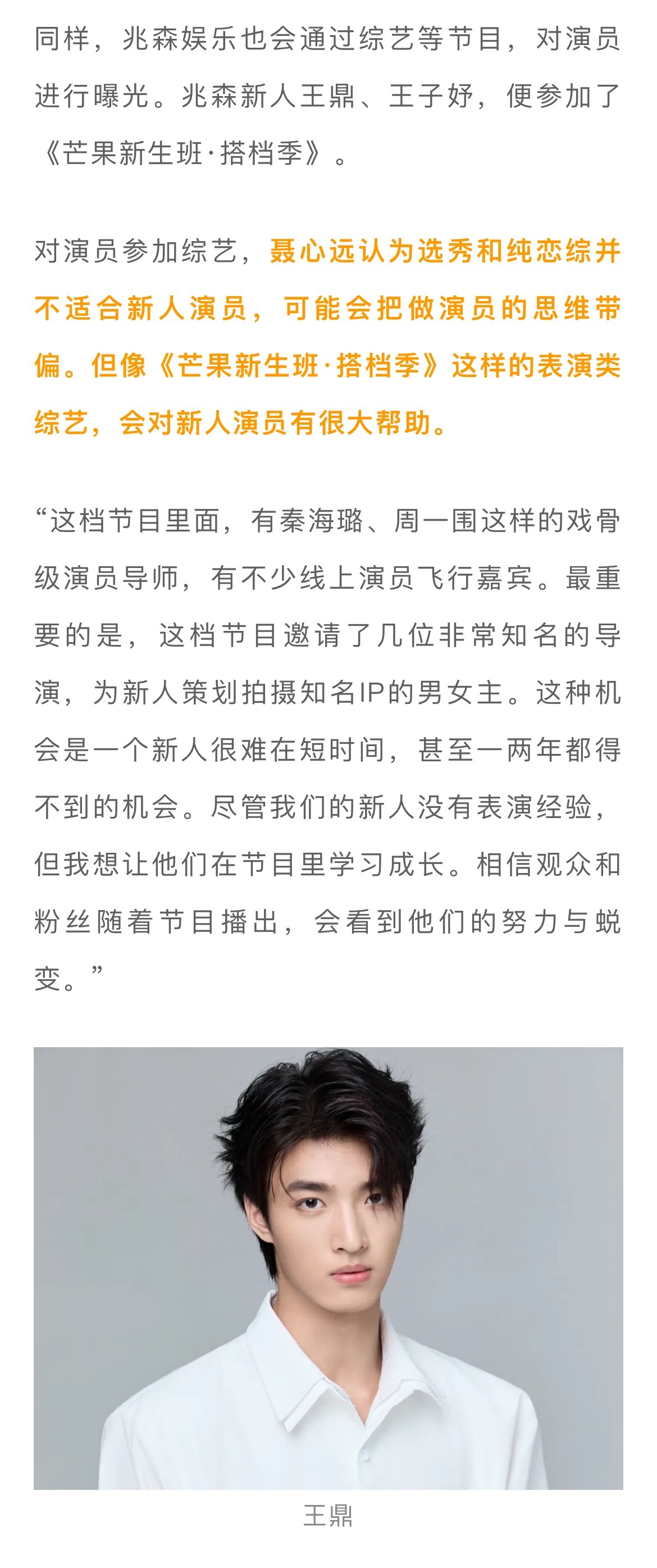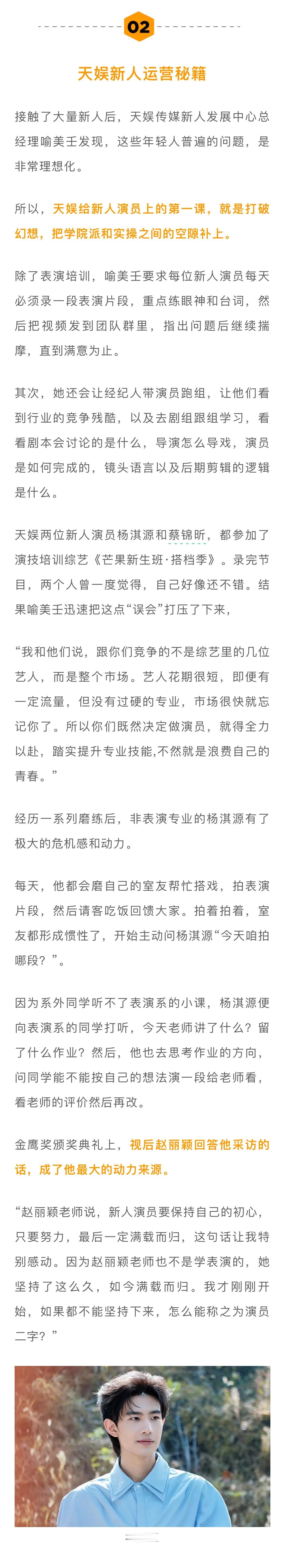 天娱两位新人演员杨淇源和蔡锦昕录完综艺后感觉良好,天娱传媒新人发展中心总经理喻美壬迅速把这点“误会”打压了下来,“艺人花期很短,即便有一定流量,但没有过硬的专业,市场很快就忘记你了。所以你们既然决定做演员,就得全力以赴,踏实提升专业技能,不然就是浪费自己的青春。”