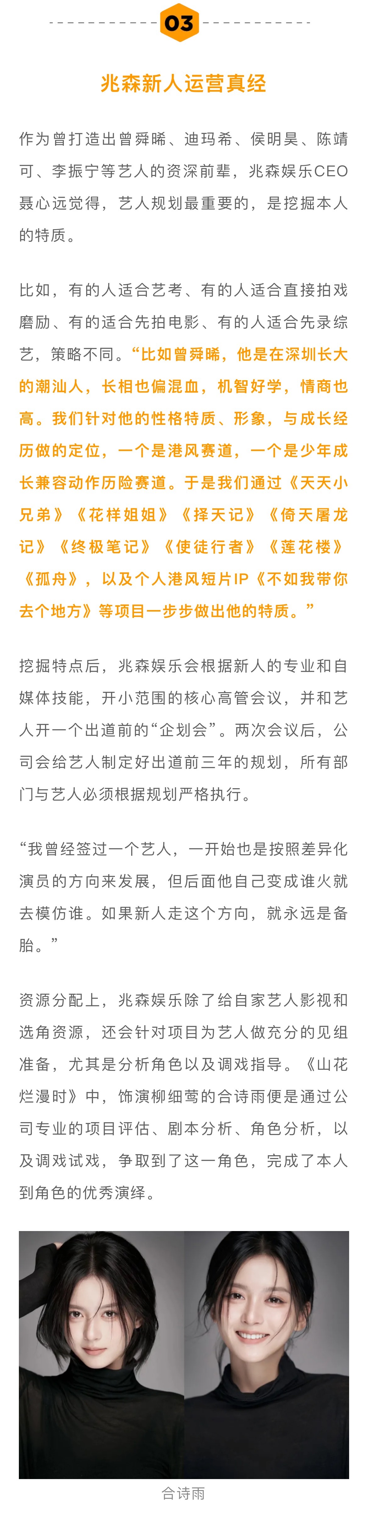 兆森娱乐CEO聂心远认为艺人规划最重要的,是挖掘本人的特质。公司会给艺人制定好出道前三年的规划,所有部门与艺人必须根据规划严格执行。“我曾经签过一个艺人,一开始也是按照差异化演员的方向来发展,但后面他自己变成谁火就去模仿谁。如果新人走这个方向,就永远是备胎。” 娱理独家 ↓