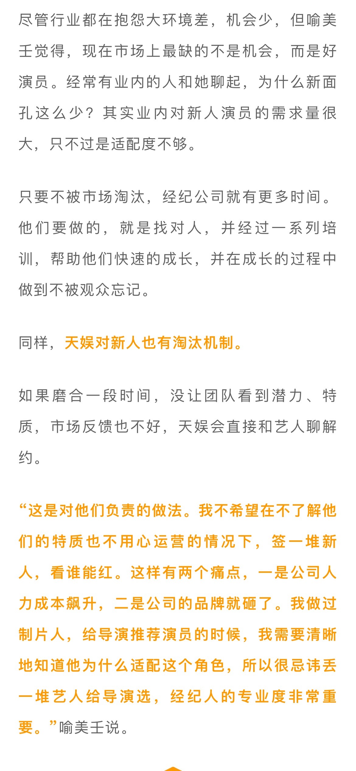 芒果对新人有淘汰机制 欢娱会教艺人如何面对负评 全民审视下,愈发专业的网友,不再接受公司对艺人“一言堂”的运营模式。网友“买股”新人演员的同时,会更关注公司的“操作”。为此,娱理工作室对话欢娱影视、天娱传媒、兆森娱乐三家头部娱乐公司,探寻新人演员的培训、运营规划。