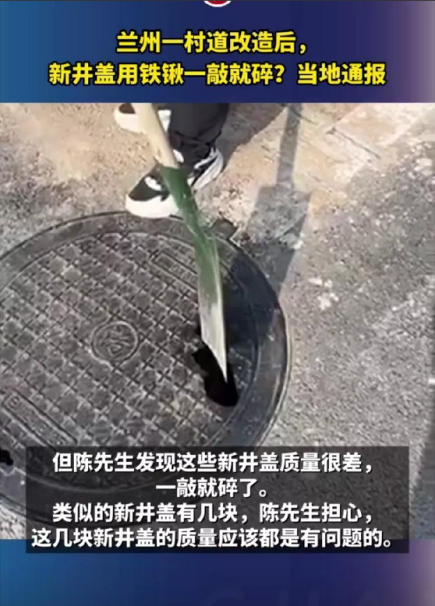 兰州井盖事件被央视曝光了! 新换的井盖居然一碰就碎了,铁锹轻轻一敲就碎,这是井盖吗?分明是陷阱!这种井盖质量这么差,施工方竟然敢用,那纯粹不把人的生命和财产当回事了吗?铁锹都能敲碎,路面上行驶的各种车辆多了,那不是妥妥的就掉下去了。真的是不敢想象! 他们这种井盖是不是在拼多多上买的呢?质量薄如牛皮,还真敢用,这是关乎人的生命和财产的大事,天理所不容的,要严查彻办施工方和相关人员,进而杜绝此类事件再次发生!