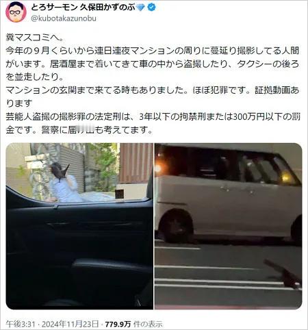 顺便提一下,久保田和信在23日的X(前推特)上透露,自9月份以来一直受到“糟糕媒体”的追逐,愤怒地表示:“每天晚上都有拍摄的人在公寓周围徘徊,有人跟着我到居酒屋,从车里偷拍,甚至有时候跟着出租车。甚至有人到公寓的入口。这几乎是犯罪。我有证据视频。”并表示考虑向警察报案。