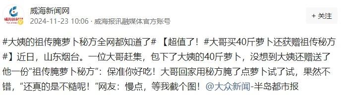 11月20日,山东有位小伙好心将大妈车上的 60 斤萝卜全部买下。大妈为表感激,把 “祖传腌萝卜秘方” 大方相赠。小伙起初心存疑虑,抱着试试看的心态亲自试验,怎料腌出的萝卜口感绝佳,令人称奇!网友:已截图,明日就去采购萝卜! 山东烟台,小伙李明经营着一家颇受欢迎的餐饮店,每日清晨,他都会来到热闹的市场采购新鲜食材。 李明在市场中穿梭,一位独自卖菜的大妈引起了他的注意。 大妈的摊位前,新鲜水灵的萝卜堆积如山,她那粗糙的双手不停整理着萝卜,眼神中满是期待。李明心中一动,觉得这位大妈如此年纪还辛苦卖菜,着实不易。 李明走近萝卜摊位,仔细端详着萝卜。这些萝卜个个饱满新鲜,散发着诱人的气息。李明想到自己的餐饮店或许正需要这些萝卜,再看看满满一车的萝卜,心中突然萌生出一个决定。 于是,他对大妈说道:“这些萝卜我全要了。” 大妈闻言,又惊又喜,瞪大了眼睛,不敢相信自己的耳朵。“小伙子,你可别开玩笑,这可有好几十斤呢。” 李明微笑着回应:“我没开玩笑,我是开餐饮店的,这些萝卜我都能用上。” 大妈的脸上瞬间被感激的笑容所占据,她手脚麻利地开始为李明装萝卜。她的动作极为娴熟,每一个萝卜都被她稳稳地放入袋中,嘴里还念念有词,不住地夸赞李明心地善良。 没过多久,萝卜便全部装袋完毕,一上秤,不多不少,恰好 40 斤。李明顺利付完钱,正欲抬脚离开之际,大妈却一个箭步上前,伸手拉住了他的衣袖。 紧接着,大妈衣兜里取出一张叠得整整齐齐的纸条,神色凝重且略带神秘地递向李明。 李明疑惑地接过纸条,只见上面详细地罗列着腌萝卜的配方,各种调料与萝卜的比例精准无误,仿佛是开启美味大门的密码。 大妈虽未言语,但那眼神分明在告诉李明,照此腌制,定能收获绝佳美味。 李明怀揣着萝卜与秘方回到了餐饮店。望着店内角落里那一堆萝卜,他的心中被强烈的好奇所填满。 在这股好奇心的强力驱使下,他决定即刻动手,亲自验证这个秘方的神奇之处。他严格按照秘方上的步骤,有条不紊地对萝卜进行腌制。 经过几个小时的漫长等待,腌萝卜终于大功告成。李明迫不及待地拿起一块尝了尝,瞬间,他的眼睛亮了起来。 这腌出来的萝卜口感滑嫩,清脆爽口还带着甘甜,味道着实惊艳。李明兴奋不已,连忙让店里的员工也来品尝。员工们尝过之后,纷纷赞不绝口。 李明觉得这么好吃的腌萝卜应该和大家分享,于是他拿出手机,将这件事发到了网上。没想到,这个祖传秘方瞬间在全网疯传。 网友们议论纷纷。其中一些人对大妈的做法啧啧称奇,认为大妈颇具商业智慧。 与此同时,大量的网友们行动极为迅速,他们赶忙对配方进行截图保存,并且兴致勃勃地讨论着要去哪里挑选品质上乘的萝卜,怎样严格按照配方的步骤进行腌制,言语之间满是对亲手制作出美味腌萝卜的期待。 参考信源:闪电新闻 (文中皆为化名)
