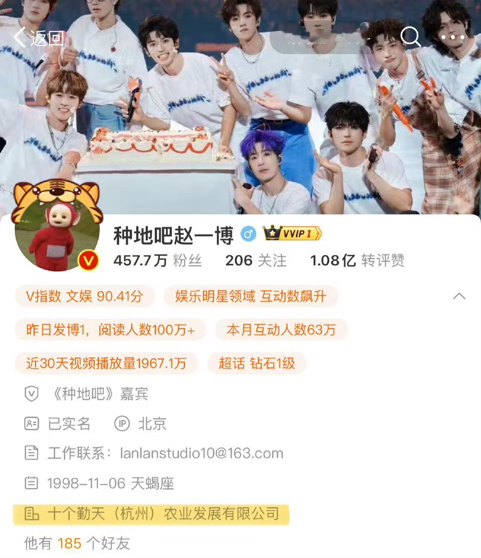 此外,赵一博改了简介增加了公司一栏:“一条十个勤天(杭州)农业发展有限公司 。”
